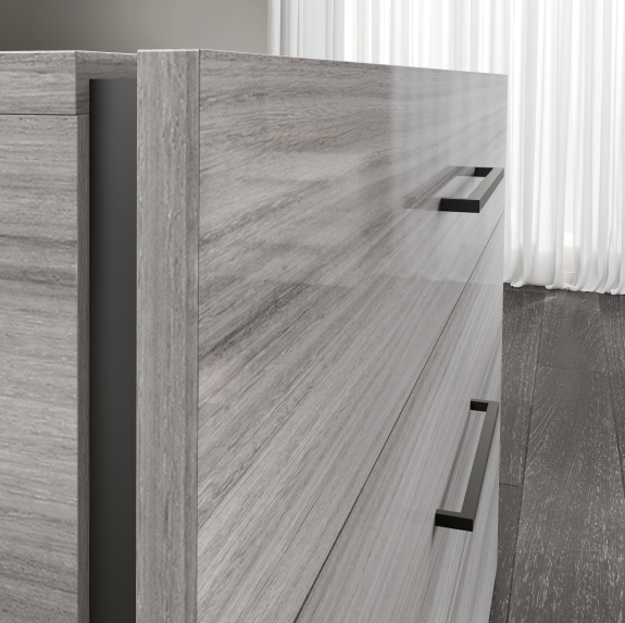 Komoda ST Mia jest wyprodukowana z materiałów wysokiej jakości. Elementy w kolorze srebrzystego eukaliptusa wykonane są w wysokim połysku który porównać można do tafli szkła. Grafitowe obrzeże wykańczające oraz uchwyty kontrastują matową fakturą.
