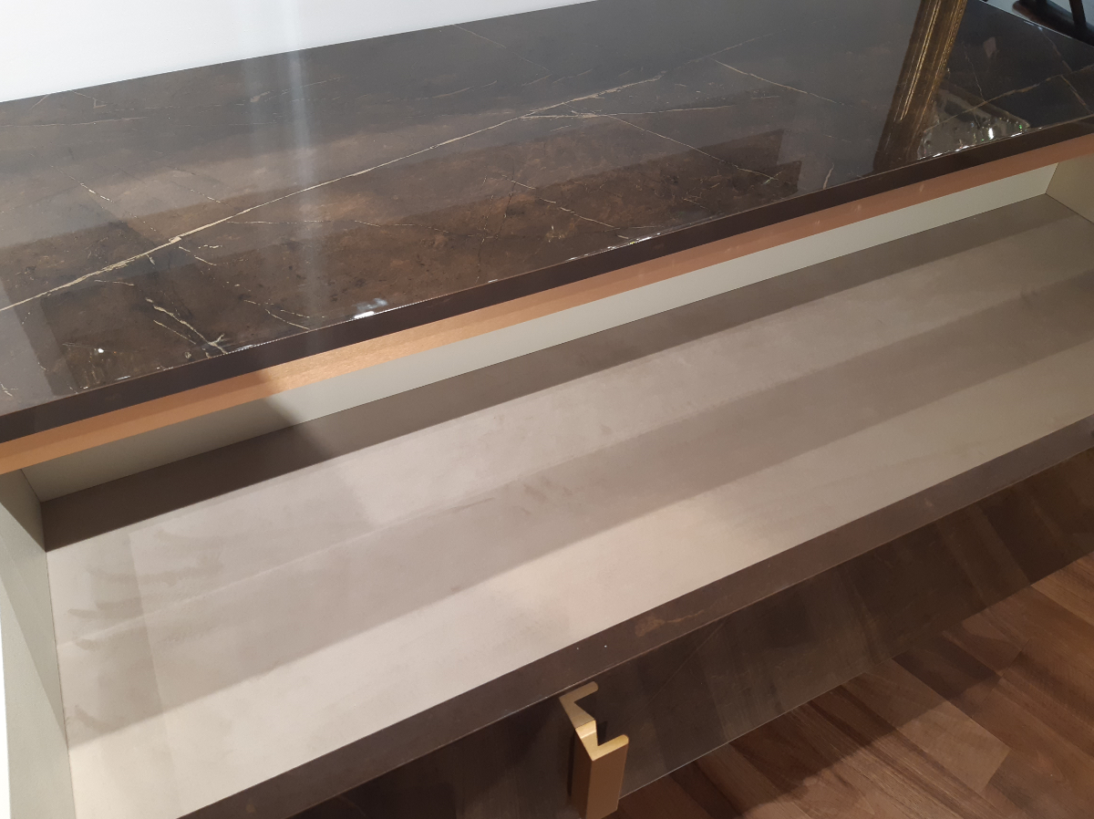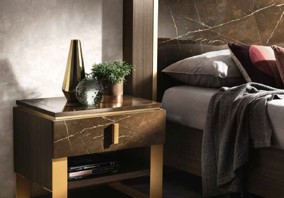 Kolekcja mebli Arr Essenza do sypialni to połączenie współczesnej nowoczesności z elegancją na najwyższym poziomie. Cechą charakterystyczną tej włoskiej kolekcji jest styl modern classic. Meble doskonale będą się prezentować we wnętrzach urządzonych w aranżacji nowoczesnej oraz glamour. Sypialnia Arr Essenza wyróżnia się niecodziennym połączeniem materiałów, które dodają jej elegancji. Ciemne drewno stylizowane na marmur, złote detale połączone z miękką tapicerką i prostymi formami to precyzyjnie dopracowane szczegóły i najwyższa jakość wykonania. Komoda i toaletka Arr Essenza posiadają cichy domyk. Wnętrze szuflad wykończone jest przyjemnym w dotyku, eleganckim welurem.Do stworzenia włoskiej sypialni Arr Essenza użyto najwyższej jakości materiałów.