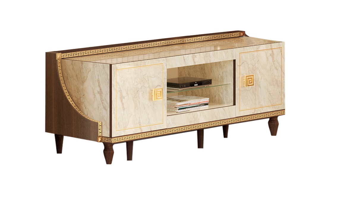 Szafka charakteryzuje się eleganckim, błyszczącym wykończeniem, które jest nie tylko estetyczne, ale również łatwe w utrzymaniu czystości. Kontrastujące kolory tworzą stylowy design, który idealnie wpasuje się w różnorodne aranżacje wnętrz. Imitacja marmuru nadaje szafce luksusowego wyglądu, doskonale komponując się z nowoczesnym wystrojem. Dekoracyjne złocenia na obrzeżach i uchwytach dodają szafce prestiżu i wyrafinowania. Centralnie umieszczona przeszklona półka z hartowanego szkła łączy dwie boczne szafki, tworząc praktyczne i eleganckie miejsce na sprzęt RTV.