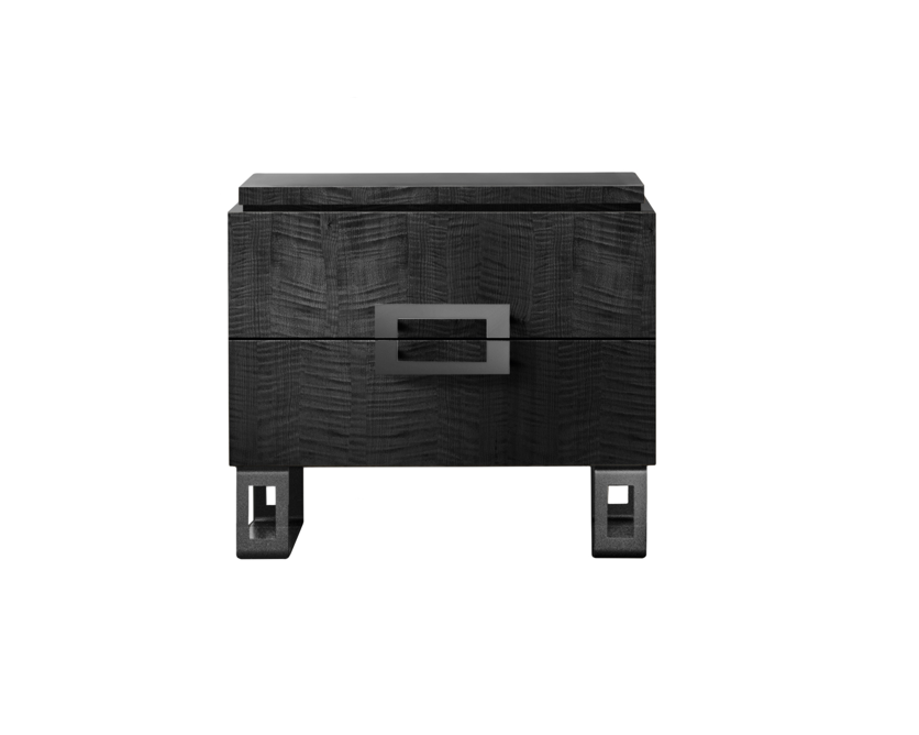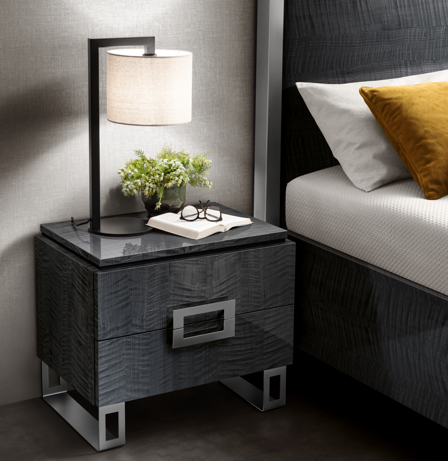 Szafka nocna z kolekcji mebli Moderna jest elegancka, ale też bardzo nowoczesna. Meble zostały wykonane w odcieniach szarości i grafitu. Wzór uchwytów szafek oraz nóżek można wybrać i dopasować do swojego wnętrza w kolorze złotym lub chromie.