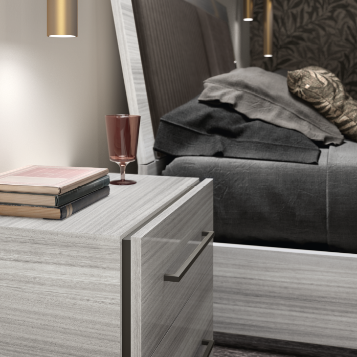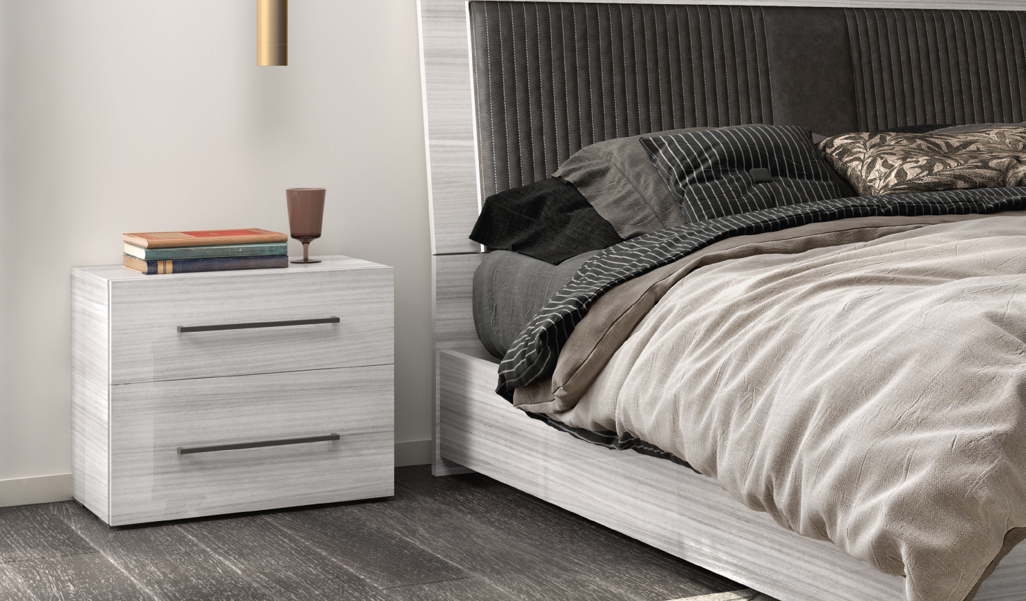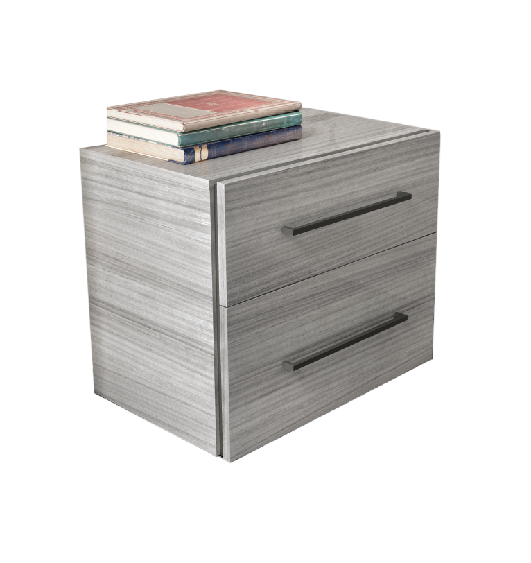 Elegancka szafka nocna Mia to prosta i elegancka forma włoskiej produkcji. Szafka posiada dwie pojemne szuflady. Wykonana jest w niecodziennym kolorze srebrnego eukaliptusa który podkreślony jest lakierem o wysokim połysku. Szafka doskonale będzie wyglądać w zestawie z łóżkiem z kolekcji Mia jak również w sypialni nowoczesnej oraz glamour. Szafka nocna Mia to włoskie wzornictwo w minimalistycznym, nowoczesnym wydaniu.
