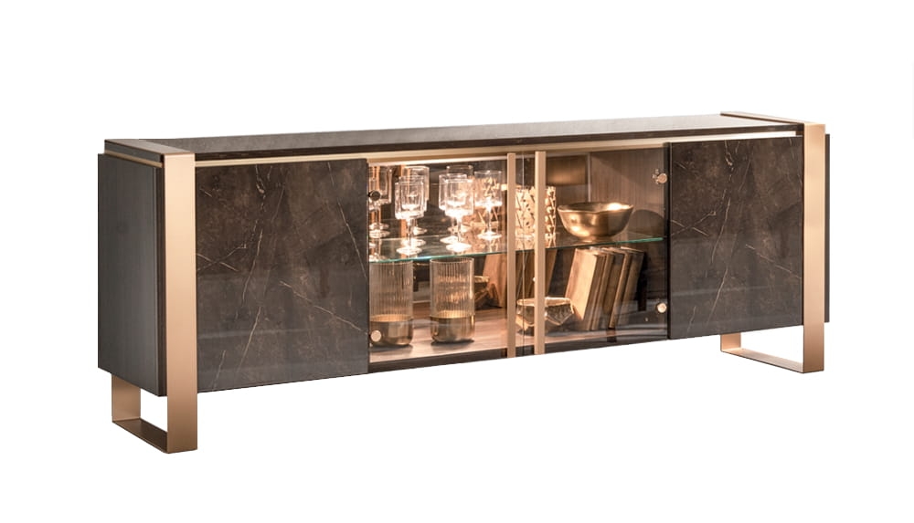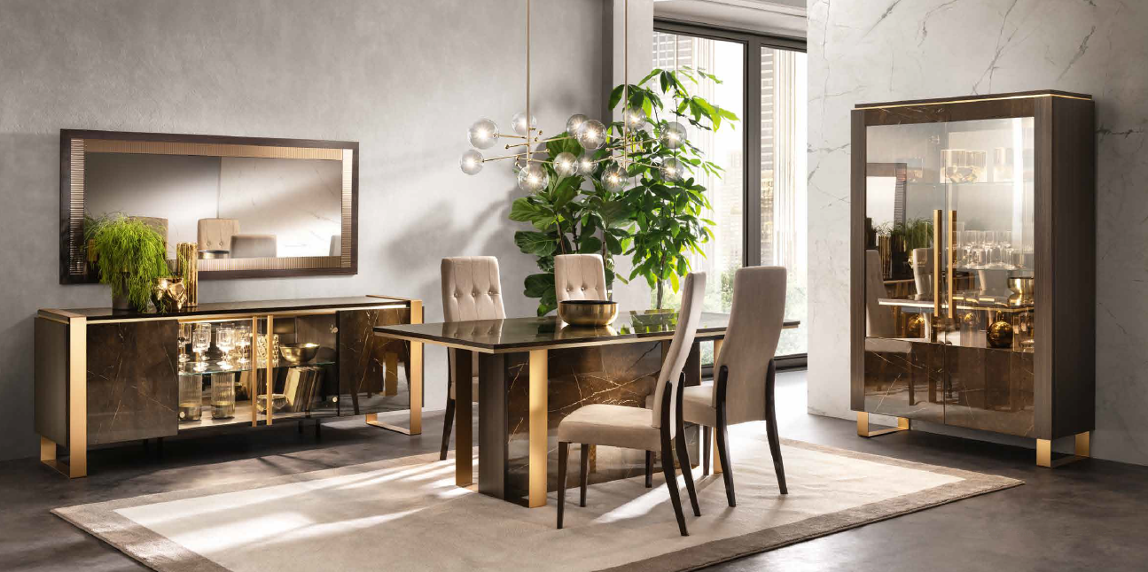 Elegancki Bufet Arr Essenza z lustrzanymi drzwiami to włoskie wzornictwo o nowoczesnym charakterze. Kolekcja Arr Essenza choć utrzymana jest we współczesnych trendach trafia również do miłośników klasycznego designu. Kolorystyka bufetu utrzymana jest w tonacji brązu, bazuje na kontraście drzewa wenge z okleiną imitującą ciemny marmur z połyskiem. Ostatecznego szlifu dodają mu dodatki w kolorze satynowego złota – nogi, uchwyty oraz ozdobna listwa usytuowana pod blatem. W jadalni z kolekcji Arr Essenza znaleźć można również: stoły, krzesła, witryny oraz lustra.