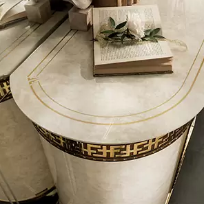 Bufet włoskiej produkcji to doskonały przykład mistrzowskiego rzemiosła, gdzie każdy detal został dopracowany z najwyższą starannością. Mebel wyróżnia się złotymi, eleganckimi ramami, które wspaniale podkreślają marmurowe powierzchnie, tworząc unikalny i ekskluzywny wygląd. Liniowy wzór marmuru w połączeniu ze złotymi akcentami nadaje bufetowi wyjątkowego charakteru, który wzbogaca każdą przestrzeń. To doskonały wybór do eleganckiego salonu, jadalni czy przestronnej sypialni, wnoszący luksus i styl.