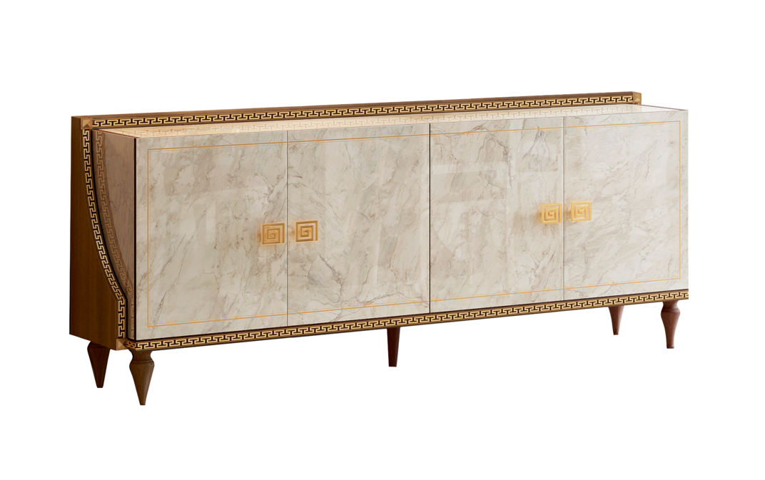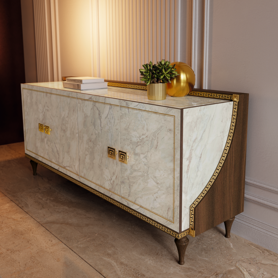 Bufet charakteryzuje się wysokim połyskiem, który dodaje mu elegancji i wyrafinowanego blasku. Kontrastujące kolory nadają mu nowoczesny i stylowy wygląd, idealny do różnych aranżacji wnętrz. Imitacja marmuru podkreśla luksusowy charakter bufetu, wnosząc do wnętrza nutę klasycznego piękna. Dekoracyjne złocenia na obrzeżach i uchwytach wzbogacają całość, nadając bufetowi prestiżowy i elegancki wygląd.
