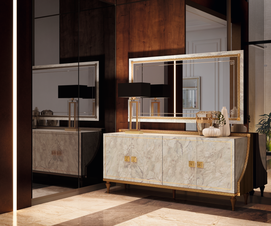 Wprowadź do swojego wnętrza powiew luksusu i elegancji dzięki bufetowi włoskiej produkcji z kolekcji Arr Romantica. Ten wyjątkowy mebel łączy w sobie wysoki połysk, kontrastujące kolory oraz imitację marmuru, tworząc harmonijną kompozycję, która zachwyci nawet najbardziej wymagających estetów.