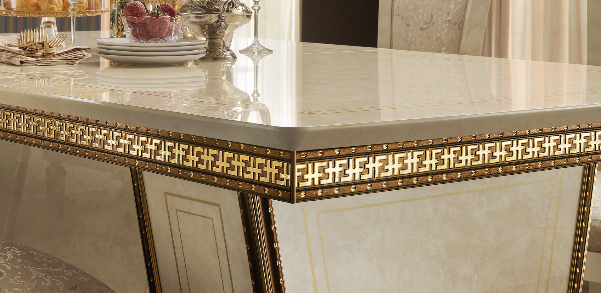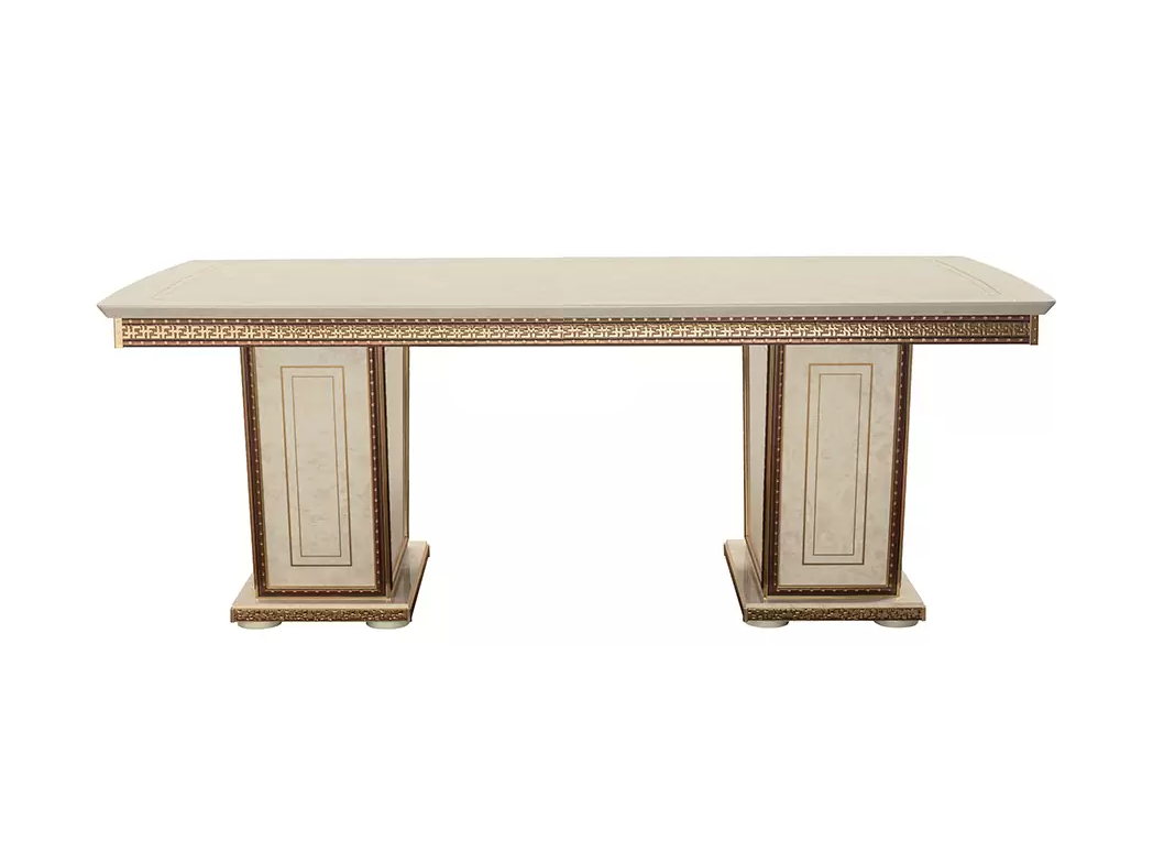 Stół Arr Fantasia ma złoty szlagmetal na ozdobnych wstawkach pod blatem, dodając całości elegancji i wyrafinowania. Zdobienia te są starannie wykonane, aby poprawić wygląd stołu i zapewnić unikalny element wizualny, który odróżnia go od innych stołów. Złoty szlagmetal odbijają światło, tworząc połyskujący efekt, który dodaje stołowi ogólnego uroku. Połączenie ozdobnych wstawek i śmiałego profilu stołu tworzy oszałamiający efekt wizualny, który z pewnością zrobi wrażenie.