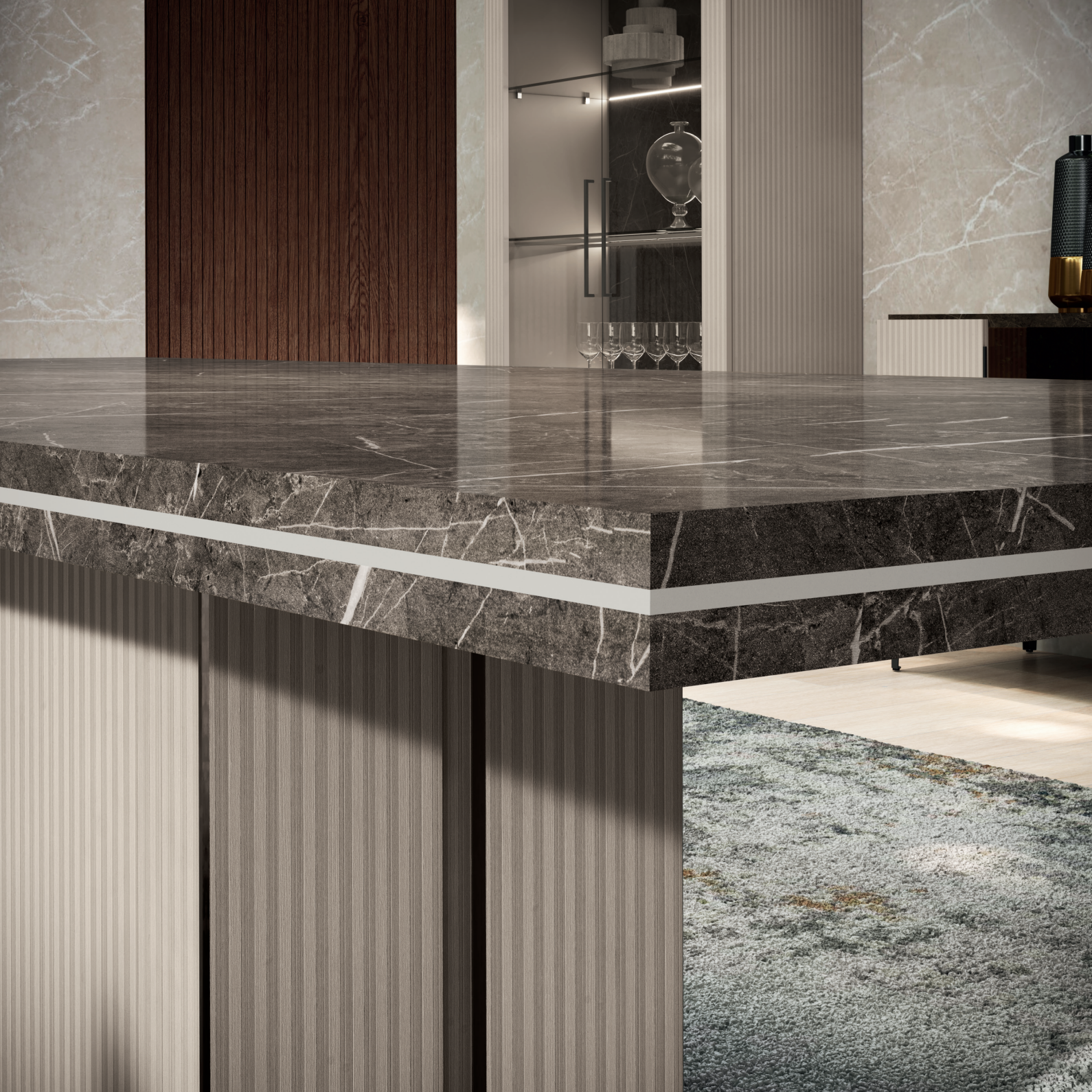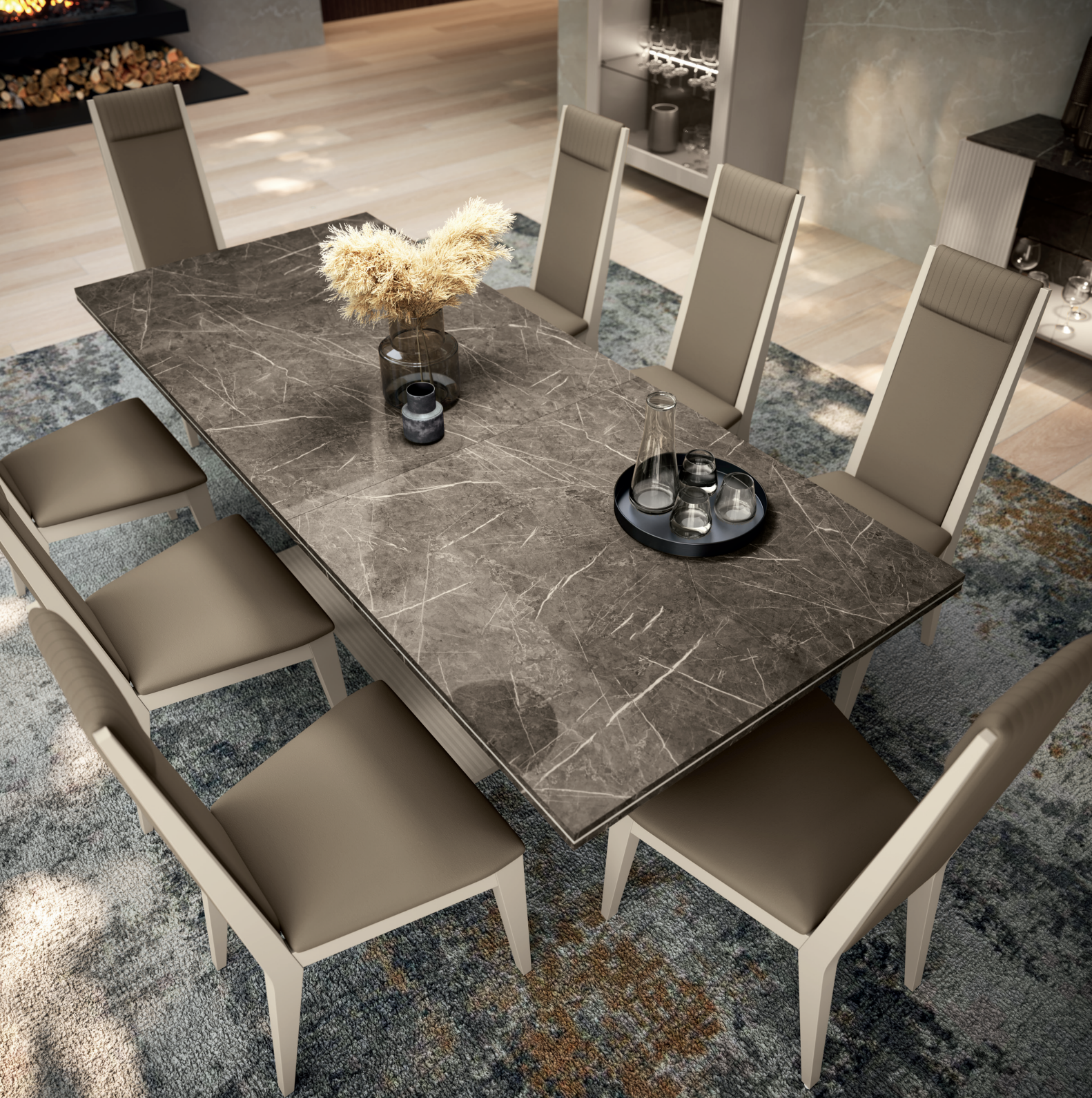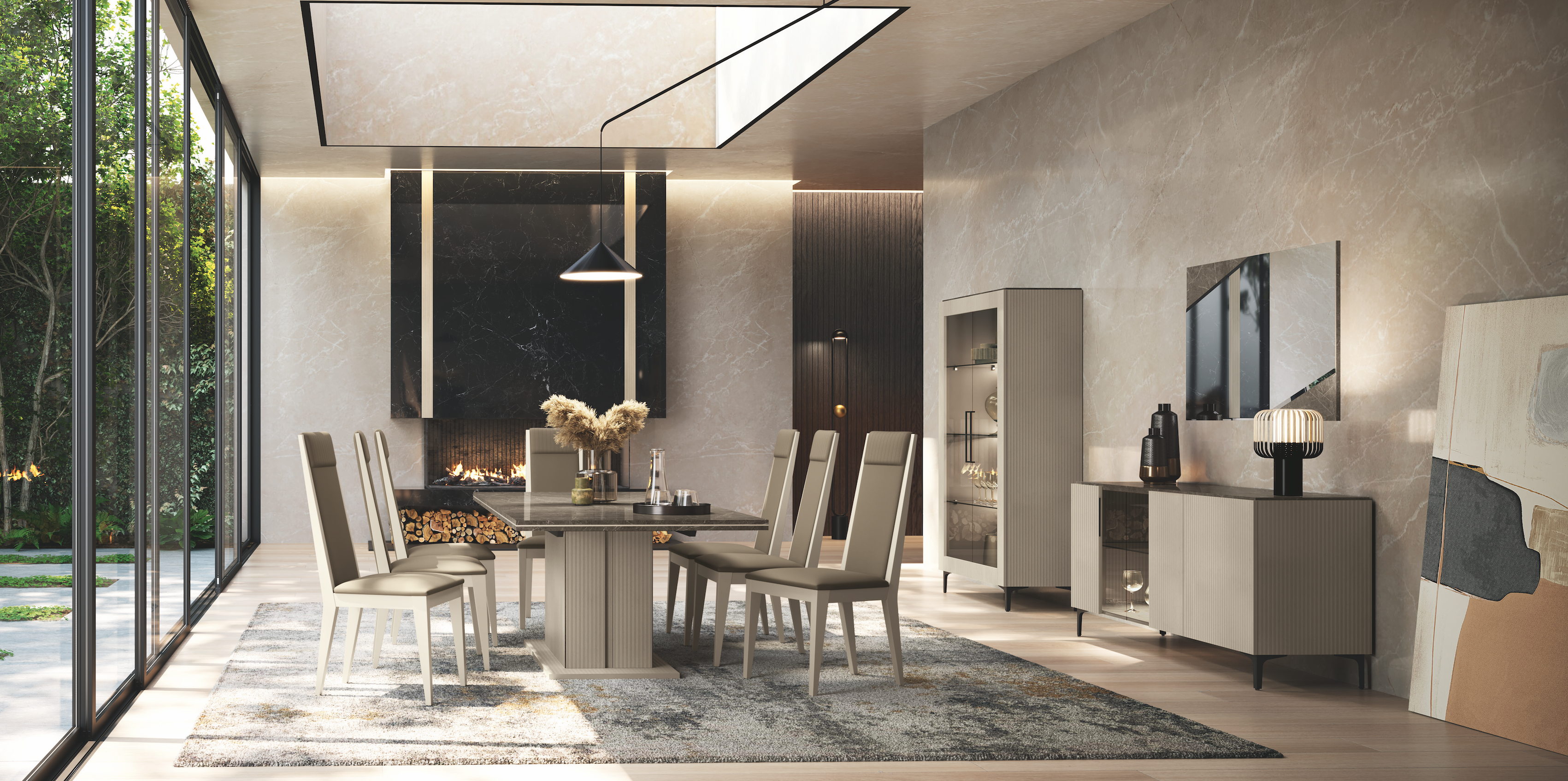 Stół Aris idealnie sprawdzi się w eleganckich jadalniach, salonach oraz otwartych przestrzeniach dziennych, gdzie styl spotyka się z codziennym komfortem. To doskonałe uzupełnienie pozostałych mebli z kolekcji Lusso, takich jak komoda z ryflowanymi frontami, witryna z oświetleniem LED czy szafka RTV z marmurowym blatem.