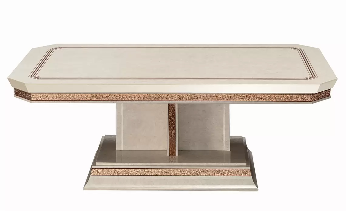 Stoliki okolicznościowe Dolce Vita mają te same kwadratowe kształty i eleganckie detale, co stoły do salonu, ale z większym naciskiem na szlachetne wykończenia. Profile nóg podkreślają ciepłe nuty wstawek z wrzośca z orzecha włoskiego, które zapewniają subtelny kontrast z metalowymi odcieniami wstęg w kolorze różowego złota oraz dekoracyjny akcent, który nadaje spójny styl całej kolekcji.
