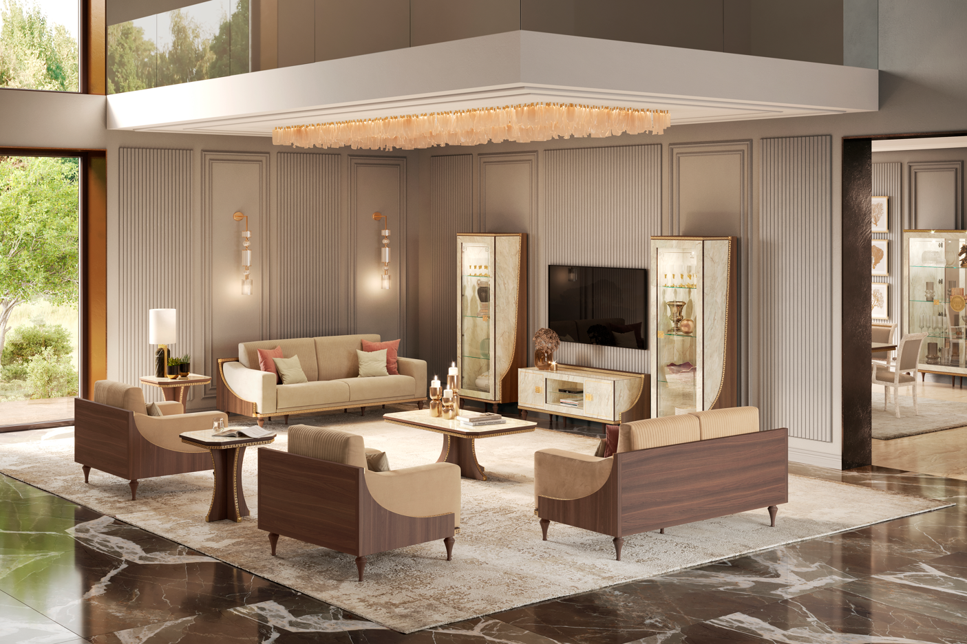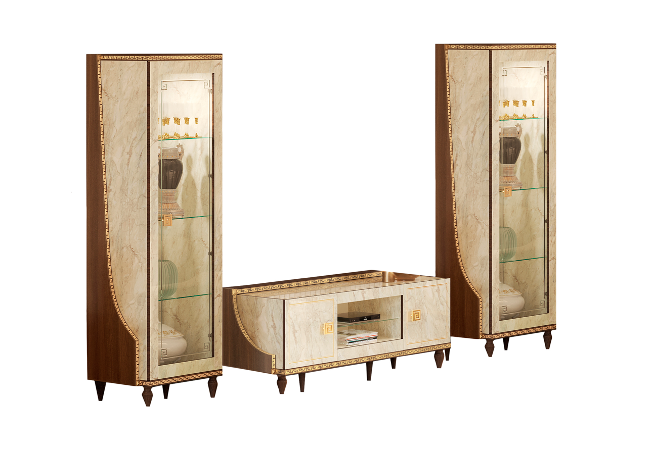 Zestaw obejmuje szafkę RTV oraz dwie witryny, wszystkie wykonane z najwyższej jakości materiałów i charakteryzujące się wysokim połyskiem, który nadaje im wyjątkowego blasku i stylu. Kontrastujące kolory tworzą elegancki i nowoczesny wygląd, doskonale komponując się z różnorodnymi aranżacjami wnętrz. Imitacja marmuru dodaje zestawowi luksusowego charakteru, podkreślając jego wyrafinowanie. Dodatkowo, dekoracyjne złocenia na obrzeżach i uchwytach wzbogacają cały komplet, nadając mu prestiżowy wygląd.
