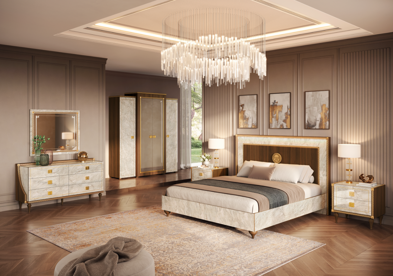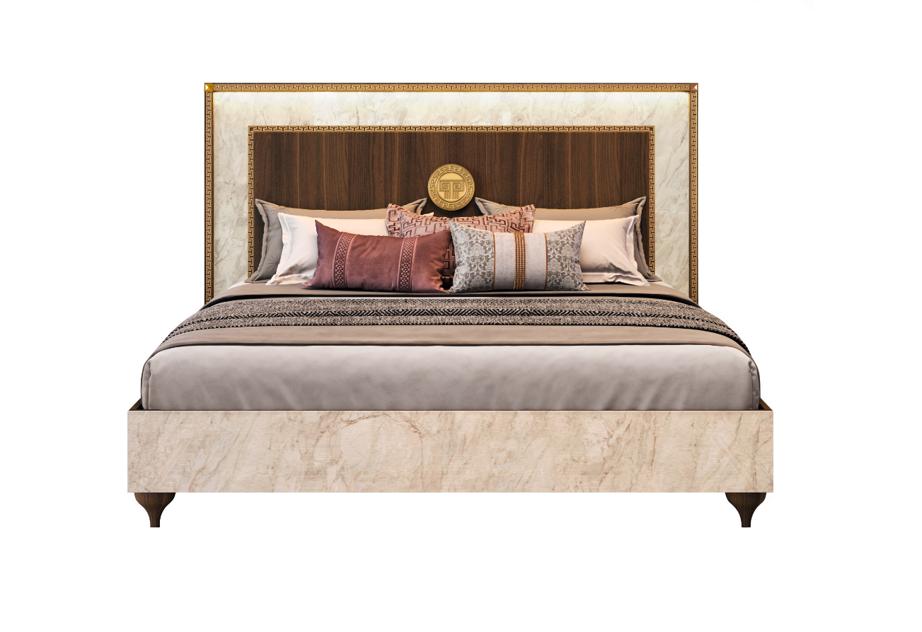 Złocone wykończenia: Złocone detale dodają łóżku luksusowego akcentu. Subtelne wykończenia w złotym kolorze podkreślają elegancję i wyjątkowość łóżka, wprowadzając do sypialni element prestiżu.