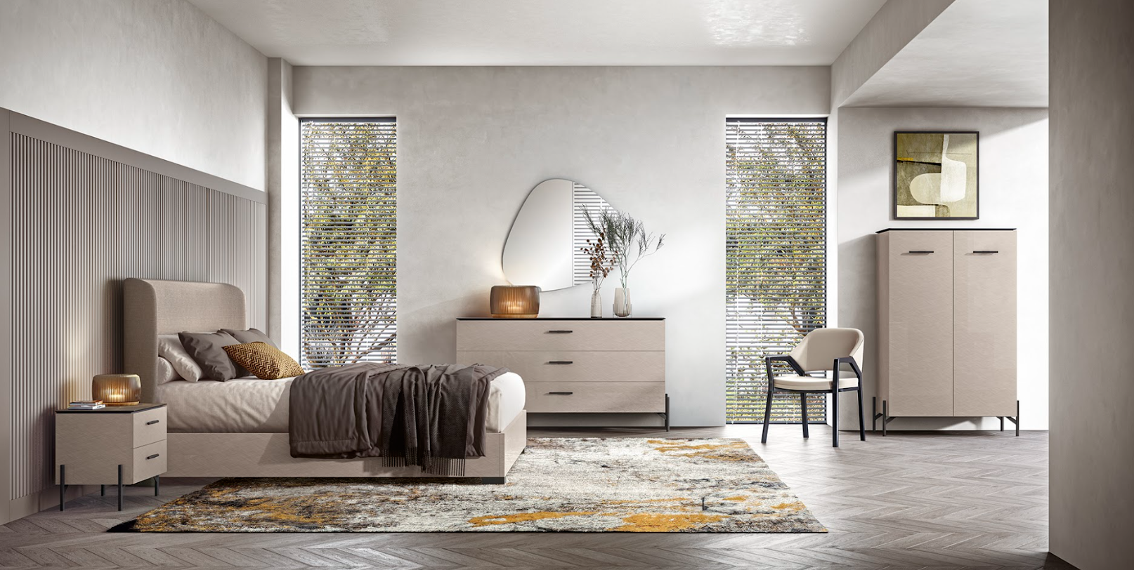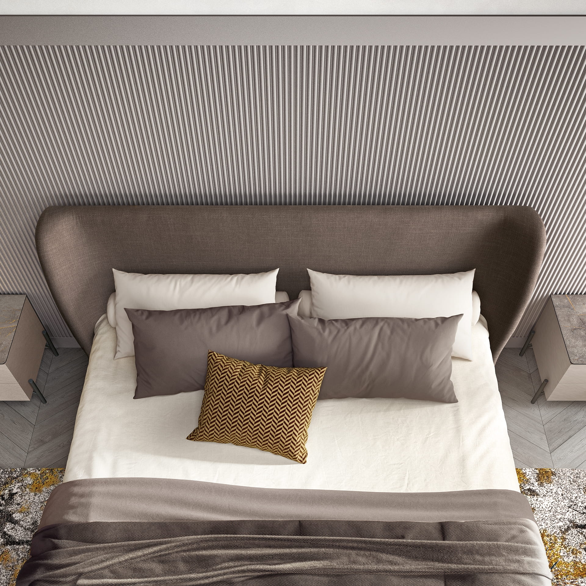 Neutralne, ciepłe kolory – mokka i piaskowy – wprowadzają do sypialni przytulną i harmonijną atmosferę, idealną do odpoczynku i relaksu. Dzięki tym odcieniom łóżko doskonale wpisuje się w różne style aranżacyjne, nadając wnętrzu ciepły, ale jednocześnie elegancki charakter. Miękkie wezgłowie zapewnia wygodę podczas wieczornego czytania lub odpoczynku, a zarazem stanowi dekoracyjny element, który wzbogaca całą przestrzeń.