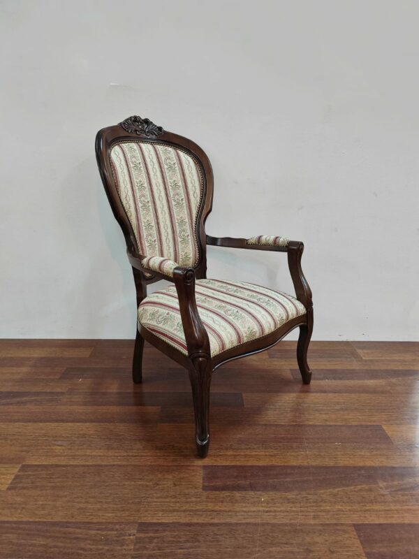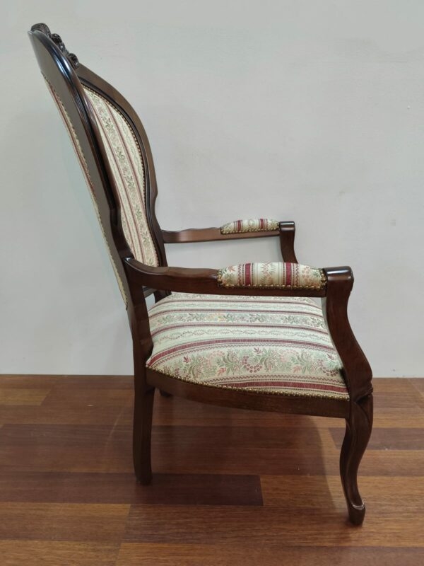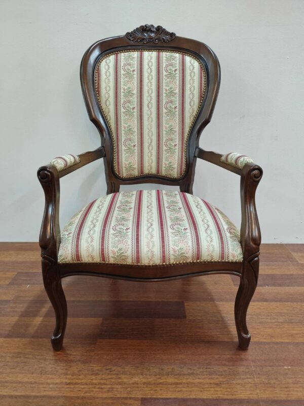 – tapicerka wykonana metodą nowoczesną tzn. gąbka poliuretanowa + pasy tapicerskie + płótno (surówka) + włoska tkanina dekoracyjna w stylowe pasy w odcieniach beżu,