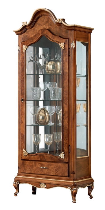 Klasyczna witryna SE 3042 to elegancki mebel włoskiej produkcji, łączący tradycję rzemieślniczą z wyjątkową estetyką. Jej rama wykonana jest z solidnego drewna toulipier, zapewniającego trwałość i wyrafinowany charakter. Plecy wykończone zostały płytą w okleinie Tanganika, nadającą całości ciepły, orzechowy odcień. Drzwi oraz szuflada ozdobione są fornirem z radiki topoli, który podkreśla unikalny styl mebla. Wszystkie rzeźbienia, misternie wykonane z litego drewna, świadczą o kunszcie włoskich mistrzów stolarskich.