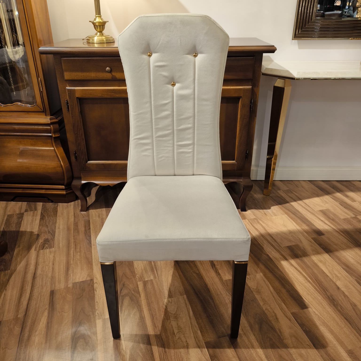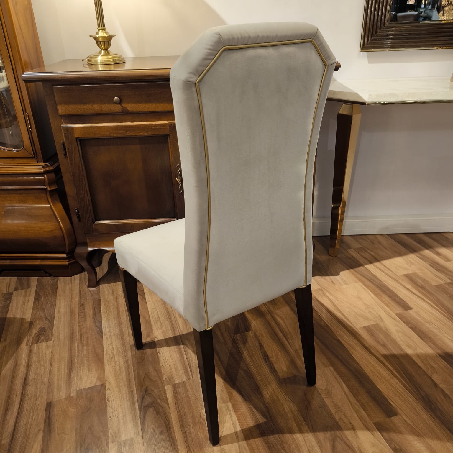 Krzesło Diamante Arr wyróżnia się niezrównanym splendorem i elegancją, przyciągając uwagę swoim wyrafinowanym designem i bogatymi detalami. Smukłe, wysokie oparcie zapewnia maksymalny komfort, a nogi w głębokim, ciemnym odcieniu orzecha dodają mu wyjątkowego charakteru, doskonale współgrając z delikatnym połyskiem złotego paska.