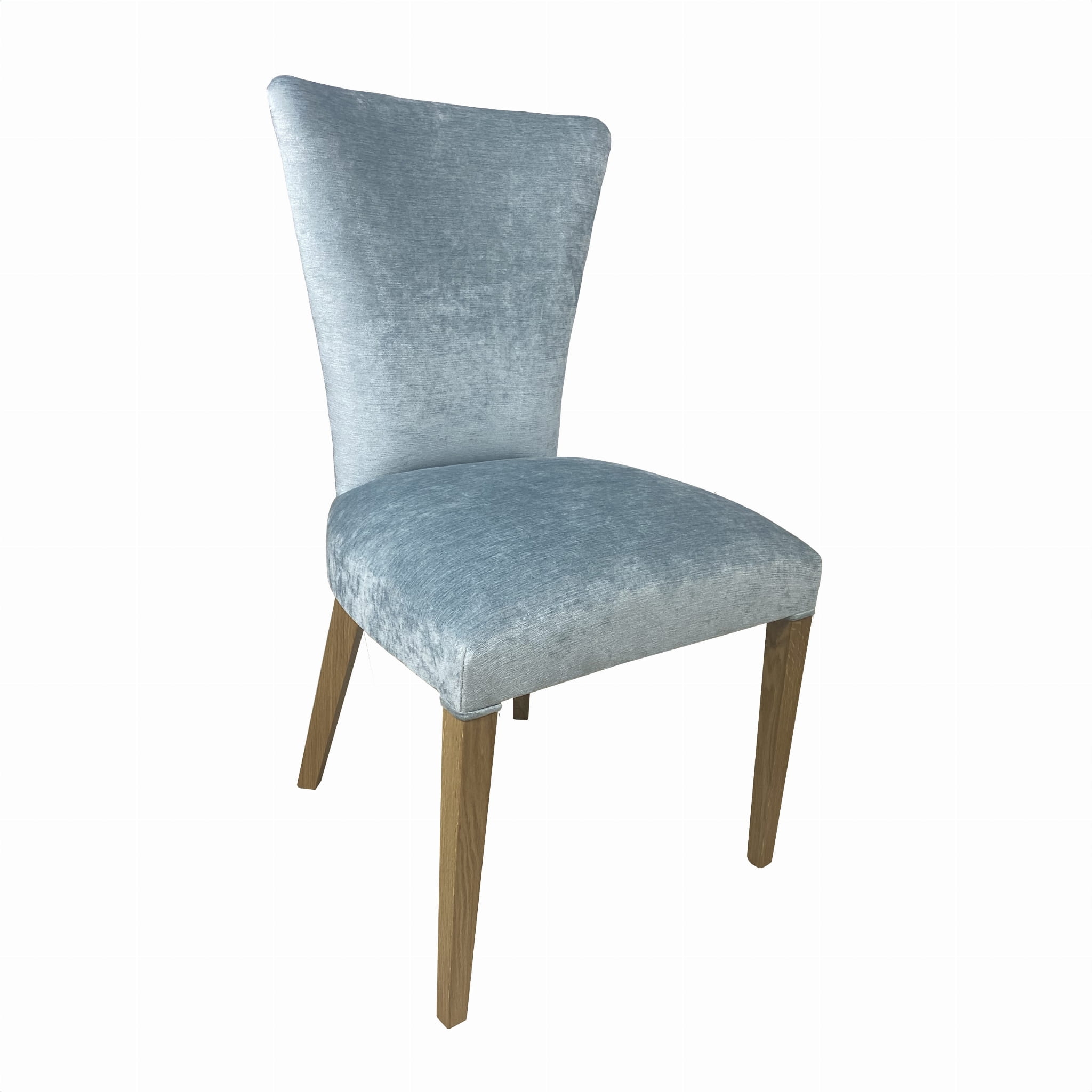 Siedzisko oraz oparcie krzesła zostały starannie obite wysokiej jakości tkaniną, zapewniając komfort użytkowania i estetyczny wygląd. Drewniane nogi dodają konstrukcji solidności oraz naturalnego ciepła, podkreślając jednocześnie ponadczasowy charakter mebla.