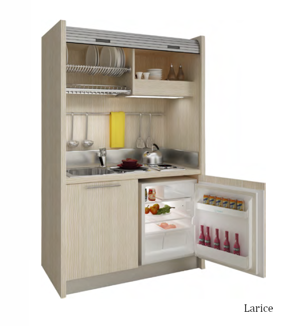 Minikuchnia to innowacyjny zestaw mebli włoskiej produkcji. Została zaprojektowana z myślą o przestrzeniach, gdzie każdy cm powierzchni ma znaczenie. Zestaw mebli kuchennych K102 to doskonałe rozwiązanie do domku letniskowego, hotelu, kawalerki czy też pokoju. Utrzymane w jasnej tonacji pasuje zarówno do wnętrz klasycznych jak i nowoczesnych. Pojemne szafki, lodówka w zabudowie, blat roboczy oraz płyta grzewcza sprawiają, że minikuchnia K102 jest bardzo funkcjonalna, kompaktowa, a także designerska. Minikuchnia została wyposażona w roletę, dzięki której można zakryć całą kuchnię, tak aby nie była widoczna dla gości. Mebel powstał z płyty meblowej laminowanej i MDF-u.