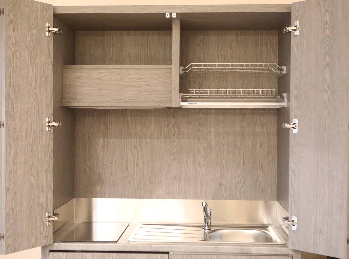 Gotowy zestaw K143 to przestrzenna kuchnia w wersji mini, która spełni oczekiwania nawet najbardziej wymagających osób. W skład zestawu wchodzi: wodoodporny blat, lodówka, zlewozmywak z ociekaczem, kranem oraz syfonem, suszarka do naczyń, okap, pojemnik na śmieci, listwa przypodłogowa PVC w srebrnym kolorze. Minikichnia K143 została wyposażona w harmonijkowe drzwi, które po zamknięciu tworzą bardzo elegancki mebel, przypominający swoim wyglądem pojemną szafę.