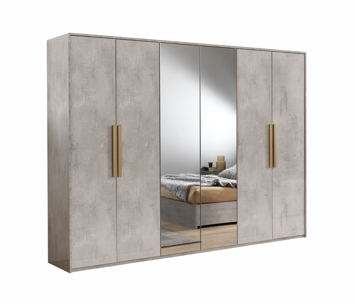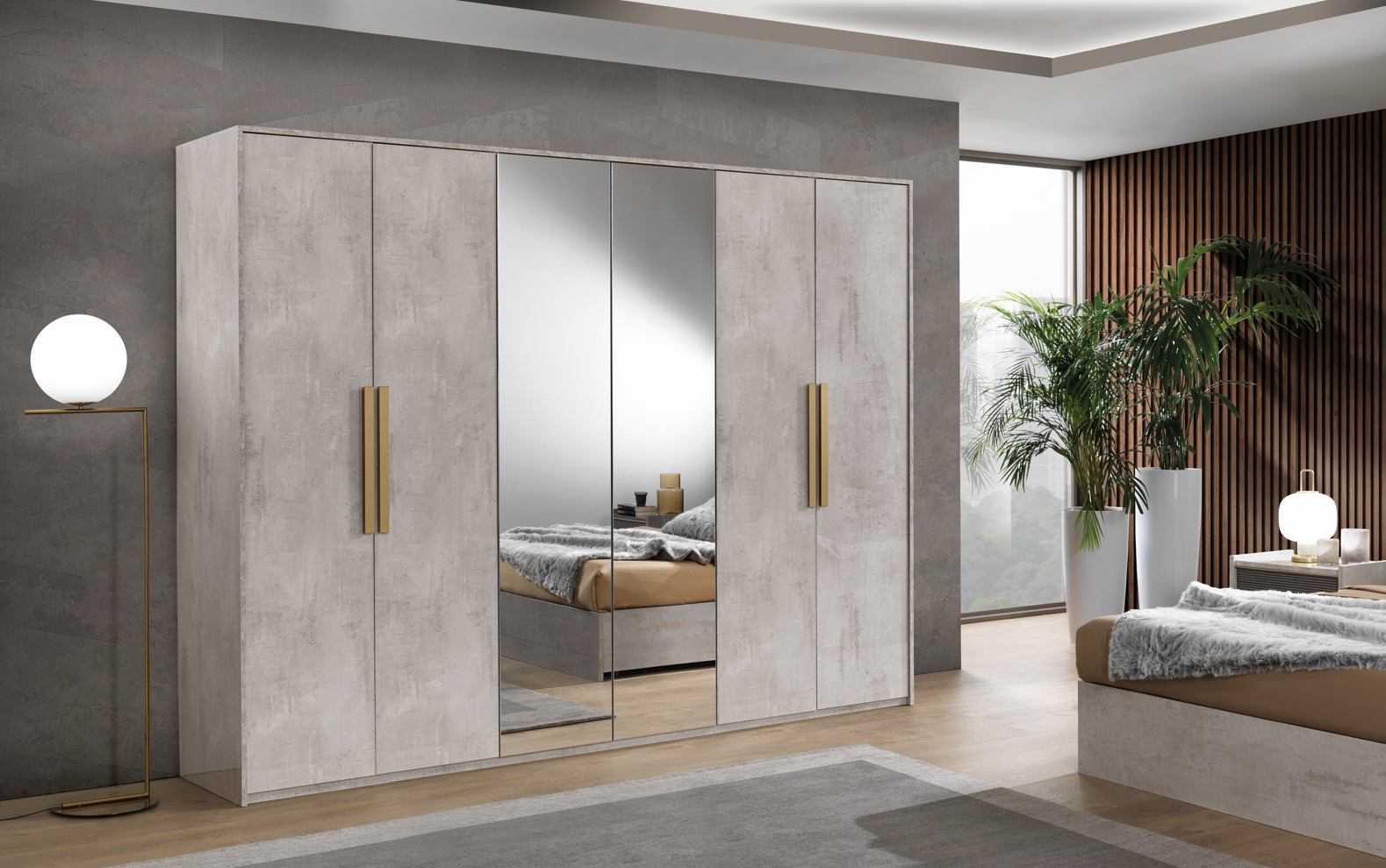 Szafa Sole 6-drzwiowa jest częścią kolekcji Sole, obejmującej także łóżka, komody i szafki nocne, które razem tworzą harmonijną i elegancką przestrzeń sypialnianą. Subtelne złote detale dodają kolekcji szlachetności, sprawiając, że wnętrze nabiera unikalnego i luksusowego wyglądu.