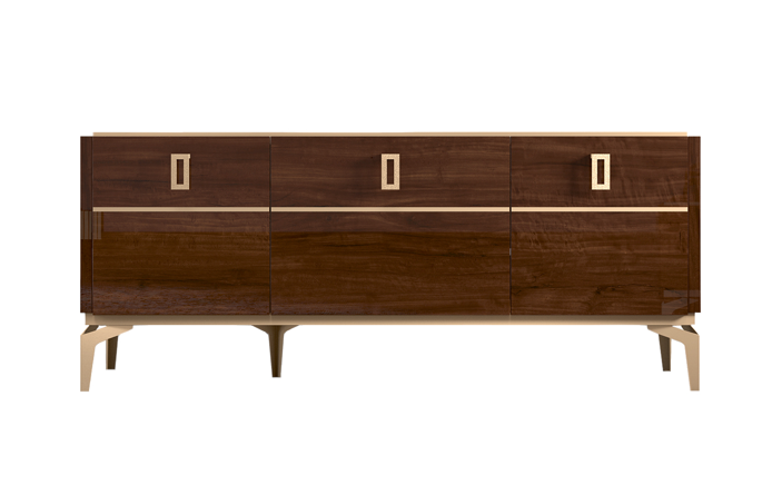 Mebel wykonany w laminacie niskociśnieniowym w kolorze orzecha włoskiego, lakier akrylowy o wysokim połysku. Materiał charakteryzuje się dużą wytrzymałością na ścieranie, zarysowania oraz uderzenia, co czyni go odpornym na uszkodzenia w codziennym użytkowaniu.