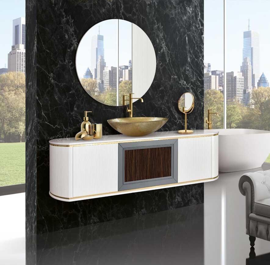 Złote akcenty na rantach dodają całości elegancji i wyjątkowego charakteru, nie dominując przy tym minimalistycznej formy. Szafka doskonale sprawdzi się w nowoczesnych i klasycznych łazienkach, zapewniając funkcjonalność oraz estetykę na najwyższym poziomie.