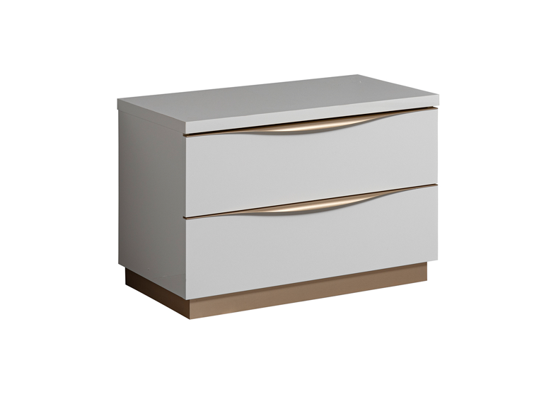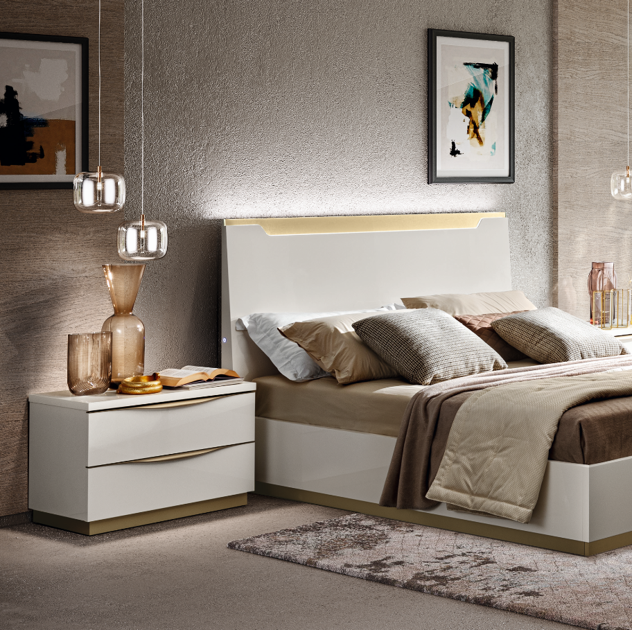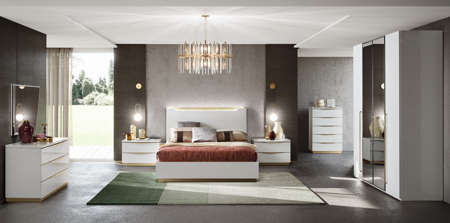 Sypialnia Kharma inspirowana jest stylistyką glamour. Wykonana w kolorze bieli na wysoki połysk. Błyszczące wykończenie jest efektowne dzięki aluminiowym uchwytom w kształcie fali. Listwy wykonane w kolorze szampańskim.