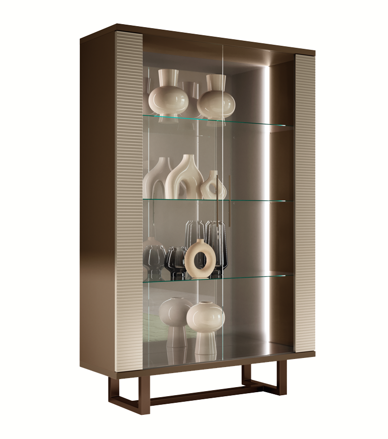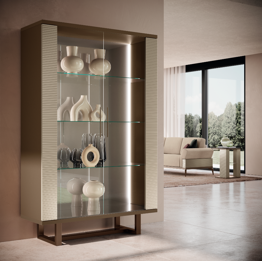 Witryna 2-drzwiowa Arr Linea to elegancki element nowoczesnego wnętrza. Wykonana w kolorze ziemistego beżu, z charakterystycznymi trójwymiarowymi liniami na drzwiach i frontach, które nadają meblowi głębię i ruch. Przeszklone drzwiczki i szklane półki zapewniają doskonałą przestrzeń do wyeksponowania dekoracji, książek czy innych przedmiotów. Geometryczne metalowe podstawy z brązowym wykończeniem dopełniają całość, wnosząc elegancję i nowoczesny charakter. Witryna doskonale wpasuje się w nowoczesne salonu, jadalni czy biura, łącząc funkcjonalność z estetyką.
