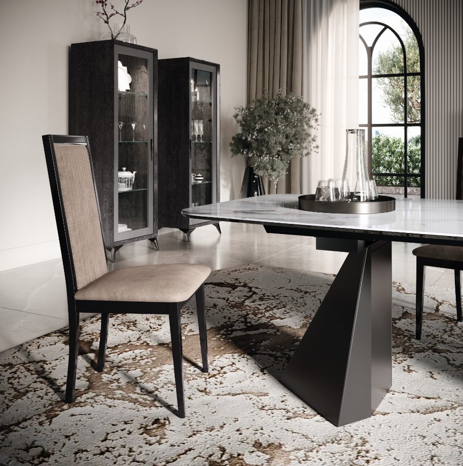 Witryna Krystal, wykonana z najwyższej jakości paneli brzozowych z wybarwieniem MedBlue, to kwintesencja nowoczesnego luksusu. Drewniane ramy o wyglądzie matowego metalu dodają nowoczesnego charakteru, jednocześnie zapewniając trwałość. Onyksowe uchwyty i nóżki o szlifie diamentowym nadają witrynie wyjątkowego, luksusowego wyglądu.