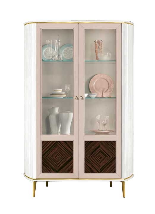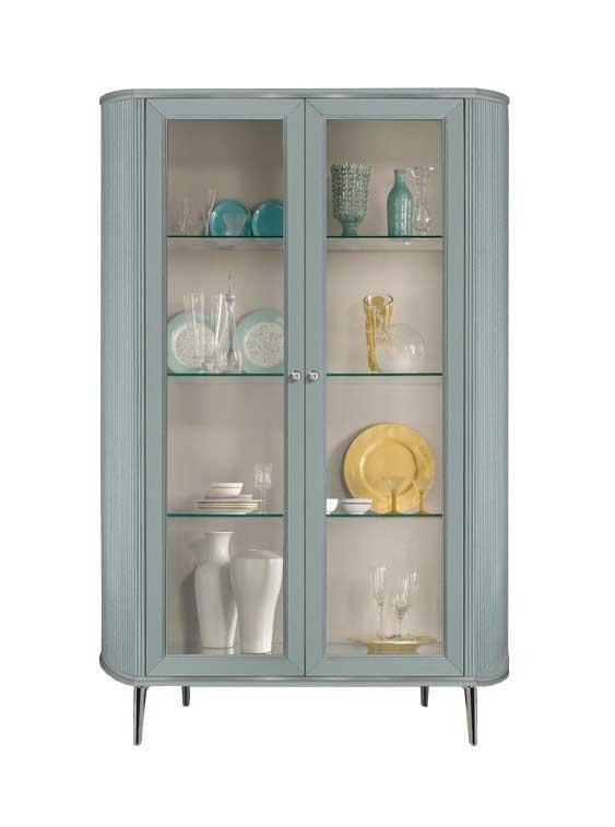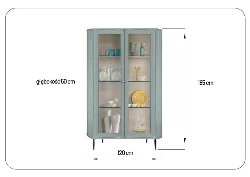 Stylowa i funkcjonalna witryna dwudrzwiowa w delikatnym, pastelowym kolorze to idealny wybór do wnętrz urządzonych z wyczuciem smaku. Jej subtelna kolorystyka wprowadza spokój i harmonię, a przeszklone fronty z eleganckimi szklanymi półkami pozwalają pięknie wyeksponować dekoracje, porcelanę lub książki.