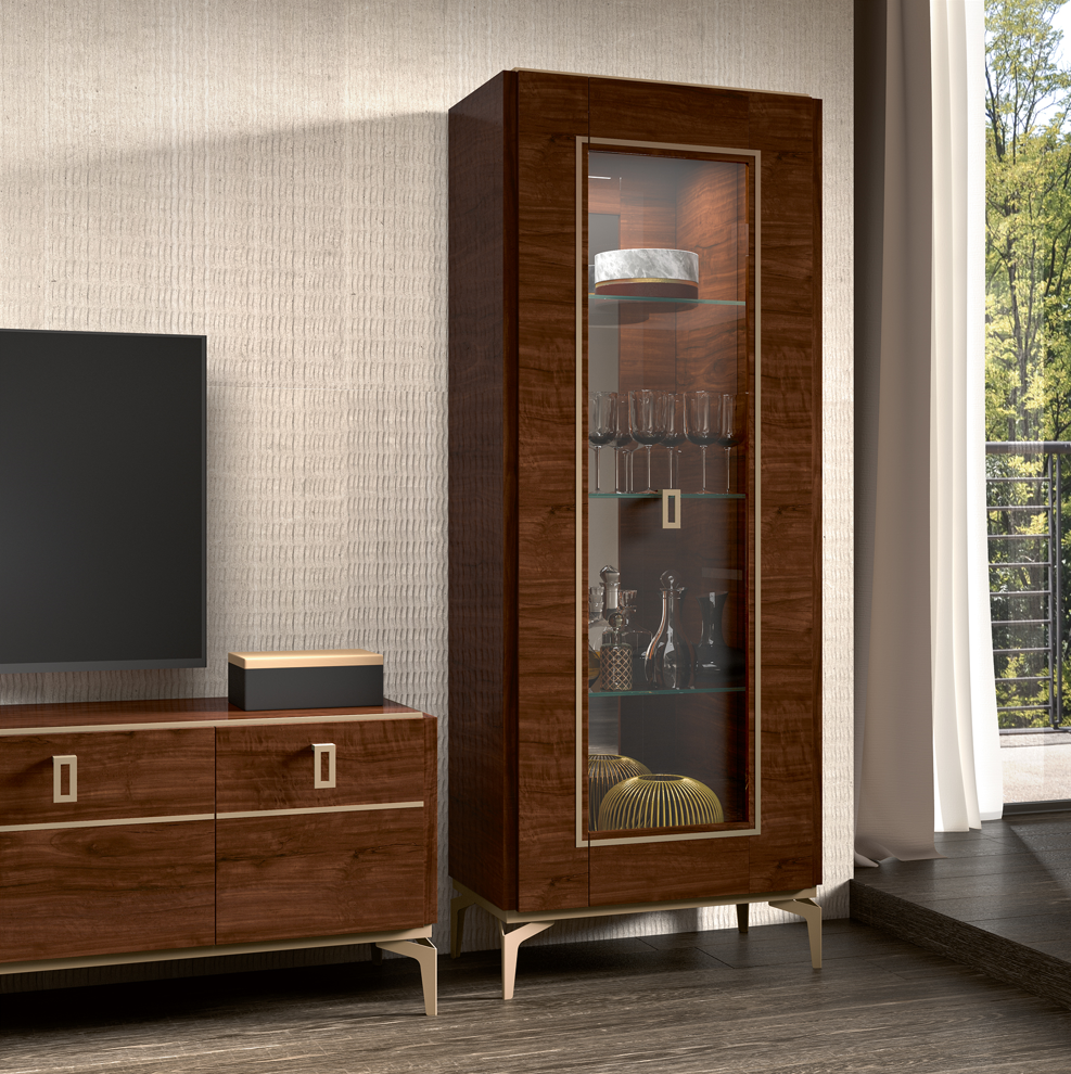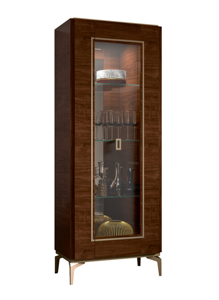 Witryna z kolekcji ST EVA to stylowy, włoski mebel do jadalni. Jego wzornictwo łączy w sobie klasykę z nowoczesnością. Witryna umieszczona jest na zgrabnych nóżkach zapewniających odpowiednią stabilność oraz trwałość konstrukcji. ST EVA to proste, a jednocześnie przyciągające wzrok meble. Przeszklona witryna, pozwala wyeksponować elementy zastawy obiadowej, porcelanowe filiżanki, a także kryształy. Włoski, lakierowany mebel w dekorze ciemnego drewna prezentuje się niezwykle luksusowo, a jego ponadczasowy charakter podkreślają subtelne zdobienia w postaci listew umieszczonych na krawędziach.