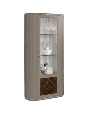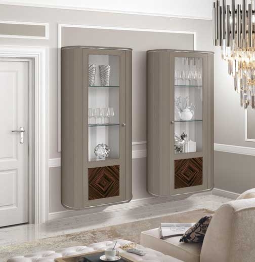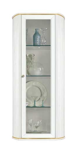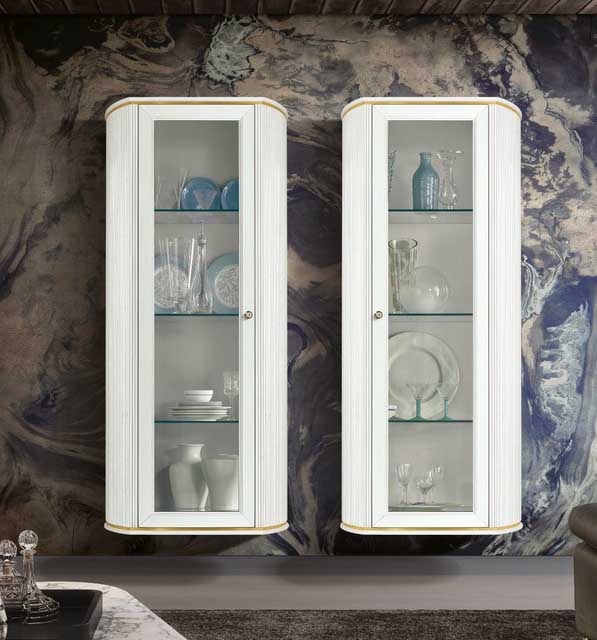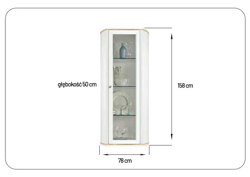 Biała z akcentem złota – elegancka, lekka i subtelna. Szklane półki pięknie eksponują przedmioty, a system cichego domyku zapewnia komfort codziennego użytkowania.