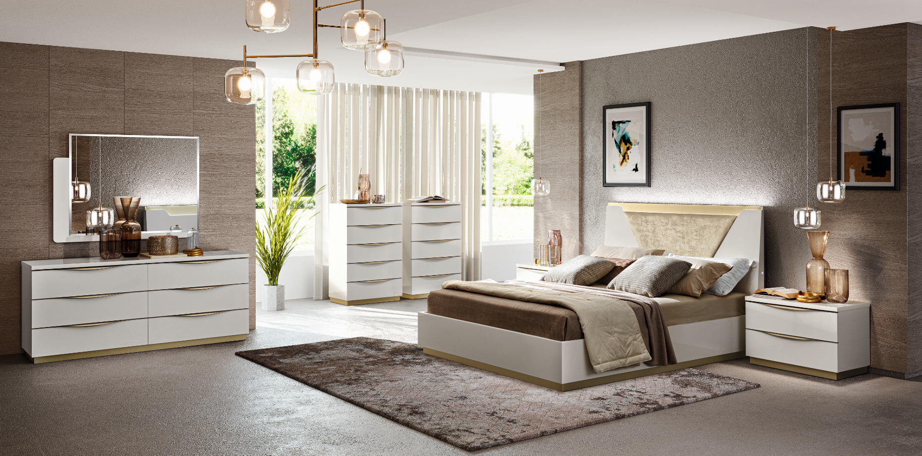 Sypialnia Kharma inspirowana jest stylistyką glamour. Wykonana w kolorze bieli na wysoki połysk. Błyszczące wykończenie jest efektowne dzięki aluminiowym uchwytom w kształcie fali. Listwy wykonane w kolorze szampańskim.