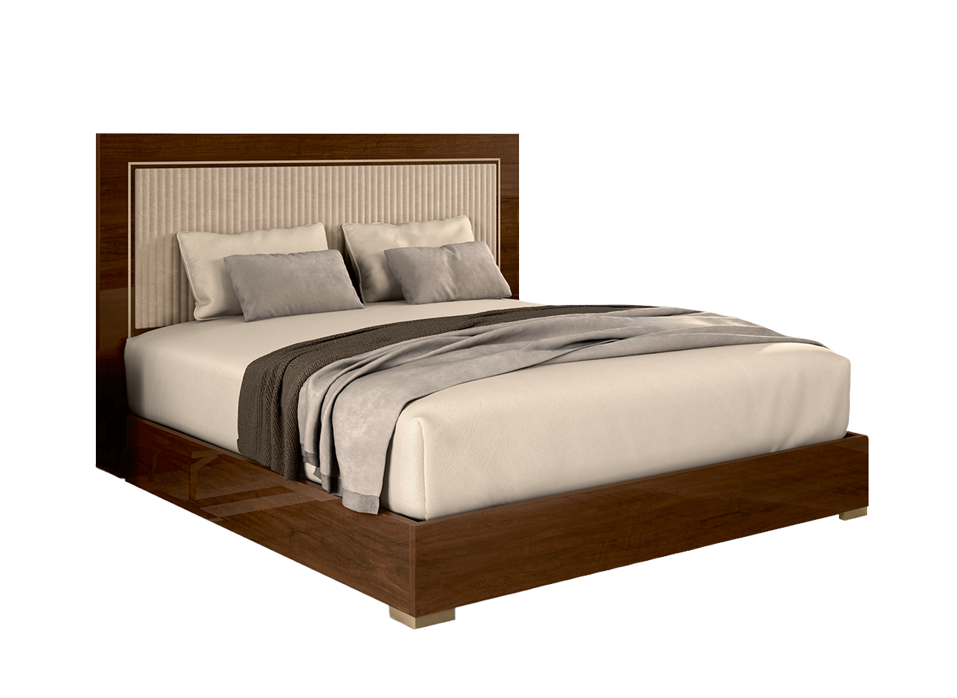 Wyjątkowe, eleganckie łóżko z kolekcji EVA. Wykonane zostało w kolorze drzewa orzechowego wykończone na wysoki połysk. Ozdobne detale w tej kolekcji wykonane są z metalu i powlekane w kolorze mosiądzu. Łóżko posiada ciekawe tapicerowane wezgłowie które dodaje lekkości oraz elegancji całemu meblowi. Doskonale wpasuje się we wszystkie klasyczne wnętrza i będzie cieszyła zarówno swym ponadczasowym wyglądem jak i doskonałym wykonaniem.
