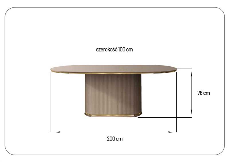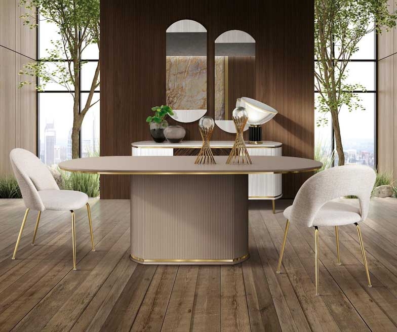 Wprowadź do swojego wnętrza odrobinę luksusu dzięki stylowemu stołowi w jasnym kolorze, wzbogaconemu subtelnymi złotymi akcentami na rantach blatu oraz u podstawy. Masywna podstawa z efektownymi, pionowymi frezami nadaje całości elegancki i ponadczasowy charakter.