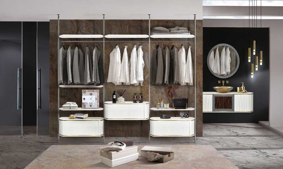 Ten funkcjonalny zestaw modułowy to idealne rozwiązanie dla osób ceniących elastyczność, nowoczesny design i możliwość dopasowania mebla do własnych potrzeb. System oparty jest na aluminiowych drążkach, ścienny lub sufitowy, w zależności od charakterystyki pomieszczenia i preferencji użytkownika.
