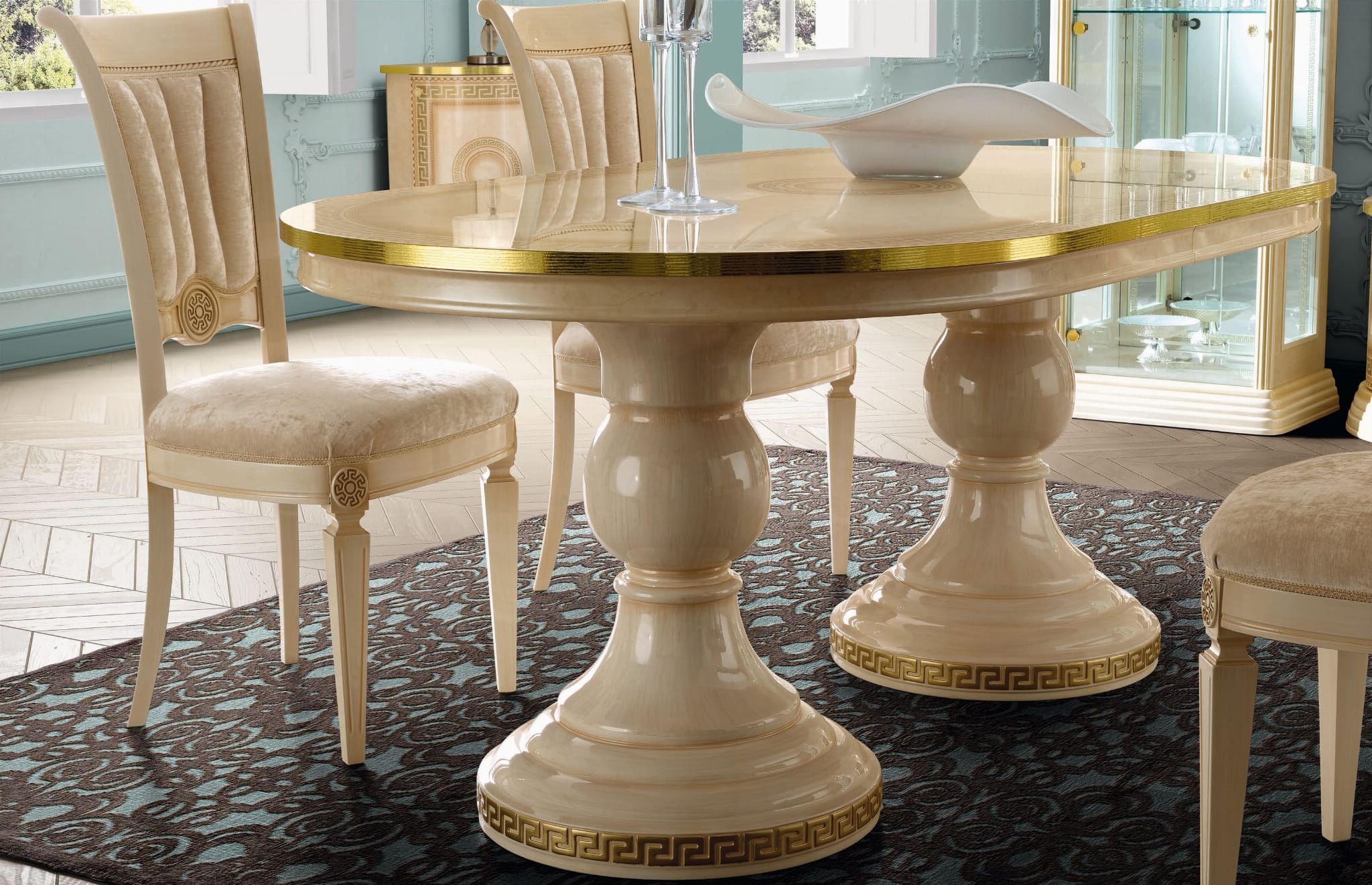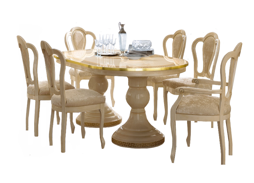 Stół w eleganckim beżowym kolorze z elementami złota, zdobiony meandrem Versace. Mebel zachwyca swoim wyglądem, a jednocześnie jest bardzo praktyczny. Zastosowane materiały w produkcji to: panele MDF, płyty płasko prasowane, płyty wielowarstwowe, całość pokryta wieloma warstwami lakieru poliestrowego, który nadaje efekt wysokiego połysku.