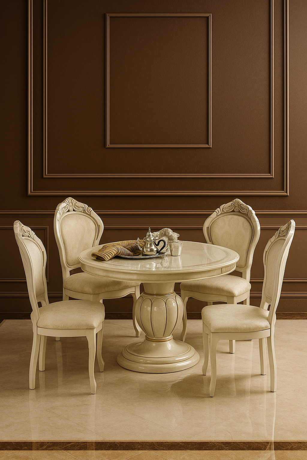 Stół Leonardo z ekskluzywnej kolekcji o tej samej nazwie to połączenie wyjątkowego designu z praktycznym rozwiązaniem, jakim jest funkcja rozkładania. Utrzymany w eleganckim beżowym kolorze z subtelnymi, złotymi akcentami, stół zachwyca szlachetną formą i luksusowym wykończeniem.