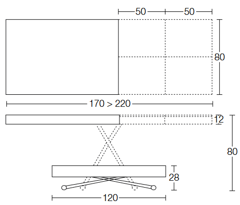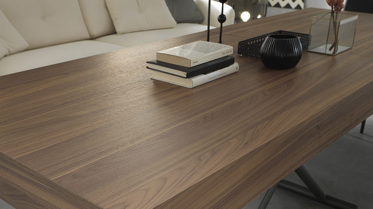 Mechanizm synchronizowany: stół posiada dwie wewnętrzne wkładki typu „portefeuille” (książkowa), które pozwalają na szybkie i łatwe powiększenie powierzchni blatu, co zapewnia wygodę podczas przyjęć i spotkań.