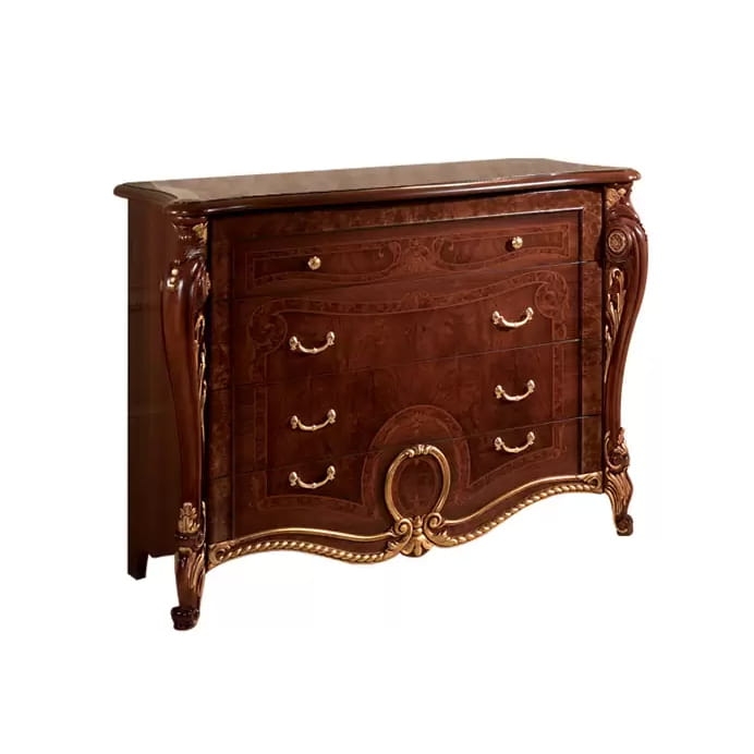 Włoska komoda Donatello to mebel który zachwyca swą formą i starannością wykonania. Komoda posiada piękne złote zdobienia które dekorują elementy rzeźbień. Mebel cechuje ciemne, wyjątkowo eleganckie wybarwienie drewna a jego ciepła tonacja dodaje mu niezwykłej klasy. Komoda Donatello zarówno dzięki zdobieniom, odcieniowi jak i formie doda wnętrzu elegancji i szyku, a jej klasyczny charakter doskonale wpisze się w stylowe wnętrze.