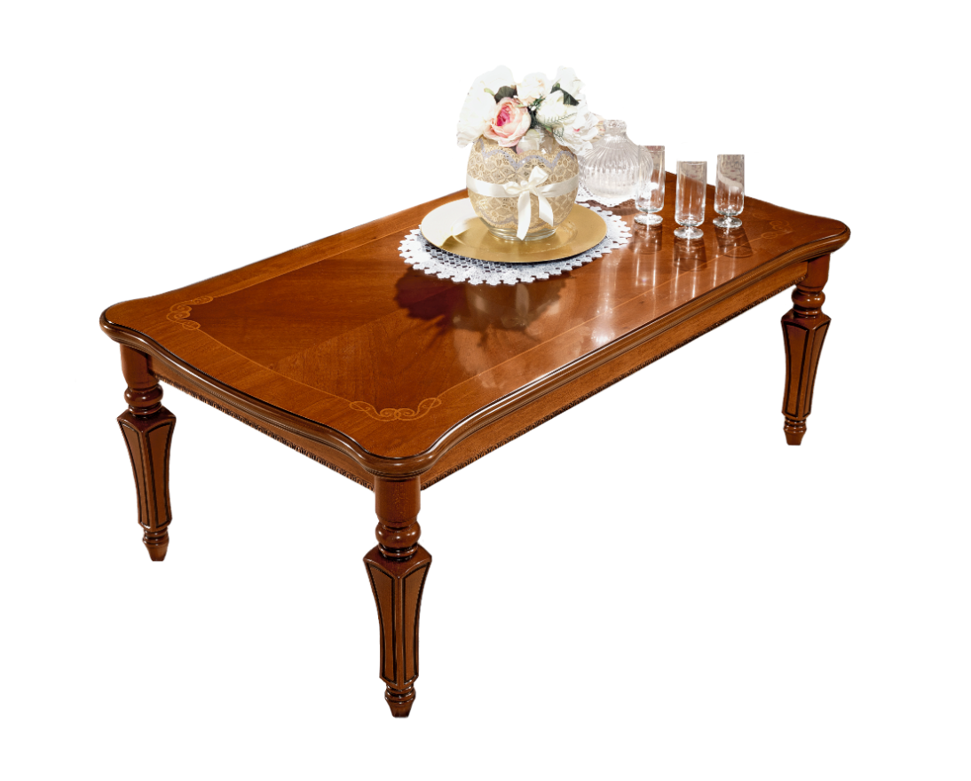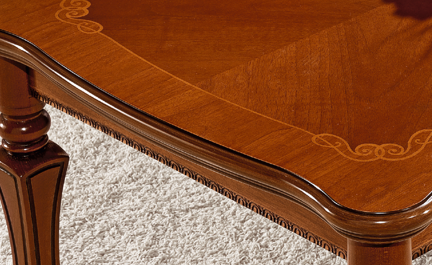 Piękna ława inspirowana włoskim klasycznym wzornictwem. Zjawiskowy mebel o rzeźbieniach mających kształt „arabeski” czyli ornamentu wywodzącego się z motywu stylizowanej wici roślinnej. Blat zdobi delikatna lecz spektakularna intarsja a całość posiada bardzo elegancki charakter.