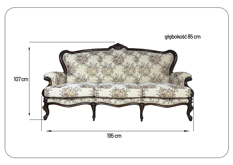 Jej solidna konstrukcja, wykonana z litego drewna bukowego, zapewnia trwałość i stabilność, co czyni ją inwestycją na długie lata. Tapicerka sofy została wykonana nowoczesną metodą, łączącą gąbkę poliuretanową, pasy tapicerskie, płótno (surówkę) oraz tkaninę dekoracyjną, co gwarantuje zarówno wysoki komfort, jak i estetyczny wygląd.