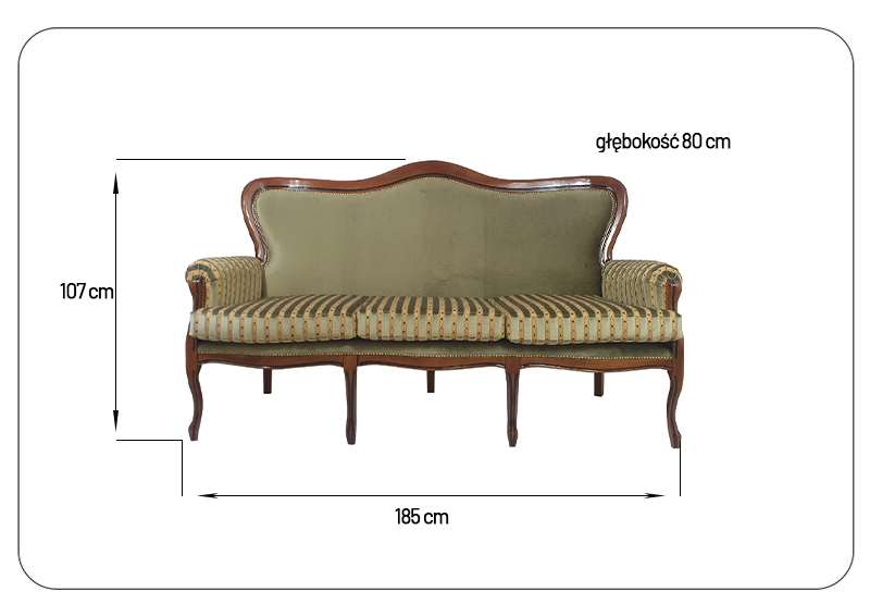 Wykonana z litego drewna bukowego, zapewnia solidną konstrukcję i trwałość na lata.  Tapicerka sofy została stworzona z zastosowaniem nowoczesnych materiałów: gąbki poliuretanowej, pasów tapicerskich oraz płótna (surówki), co gwarantuje komfort i wygodę. Na wierzchu zastosowano tkaninę dekoracyjną, która nadaje meblowi subtelną elegancję.