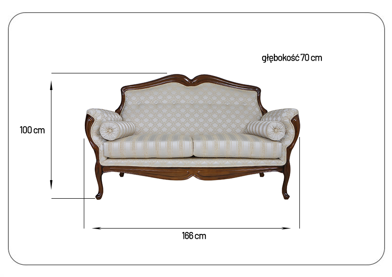 Solidna konstrukcja z litego drewna bukowego zapewnia nie tylko trwałość, ale również wyjątkowy wygląd, który doda szyku każdemu wnętrzu. Sofa została tapicerowana w nowoczesny sposób, łącząc gąbkę poliuretanową, pasy tapicerskie, płótno (surówkę) oraz tkaninę dekoracyjną.