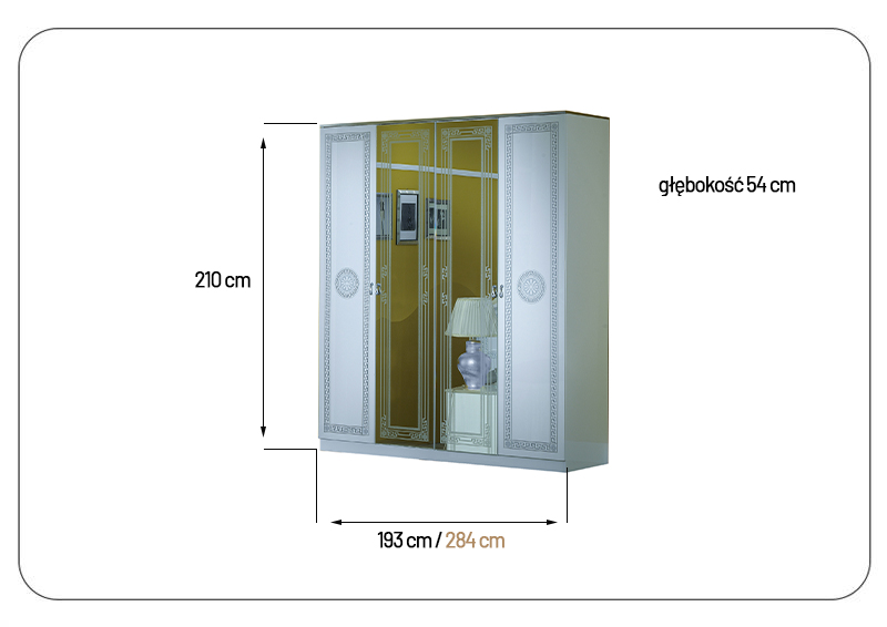 Szafa BC Serena czterodrzwiowa to połączenie praktycznych rozwiązań z estetycznym designem, który doskonale sprawdzi się w sypialni, garderobie lub przedpokoju. W centralnej części mebla znajduje się duże lustro, które nie tylko podkreśla nowoczesny charakter szafy, ale również optycznie powiększa przestrzeń i dodaje wnętrzu lekkości.