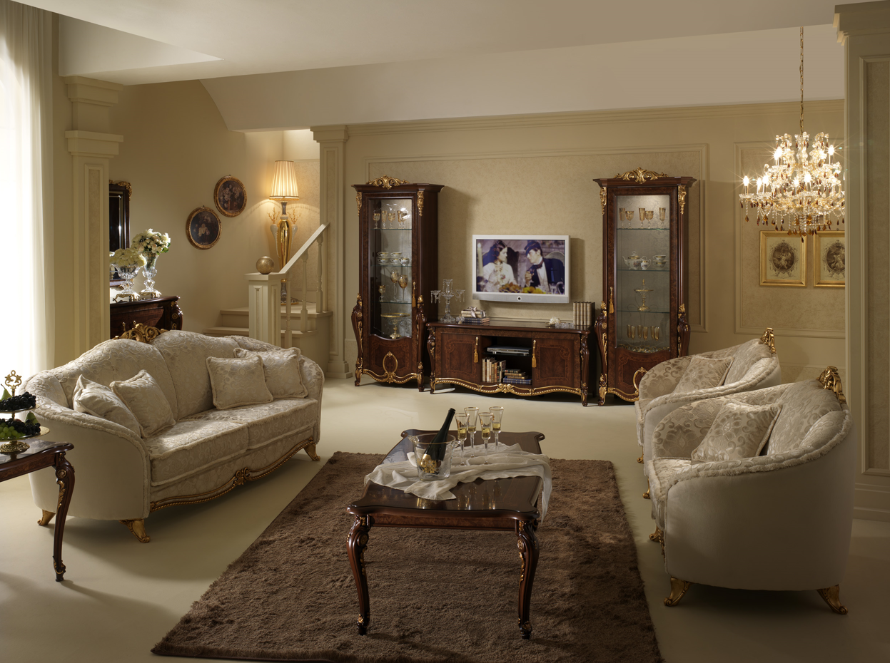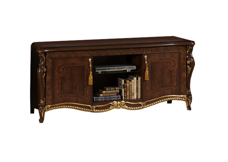 Włoska szafka RTV Donatello to mebel który zachwyca swą formą i starannością wykonania. Szafka posiada piękne złote zdobienia które dekorują elementy rzeźbień ramy mebla. Eleganckie uchwyty wieńczą złote ozdobne chwosty. Mebel cechuje ciemne, wyjątkowo eleganckie wybarwienie drewna a jego ciepła tonacja dodaje mu niezwykłej klasy. Szafka RTV Donatello zarówno dzięki zdobieniom, odcieniowi jak i formie doda wnętrzu elegancji i szyku, a jej klasyczny charakter doskonale wpisze się w stylowe wnętrze.