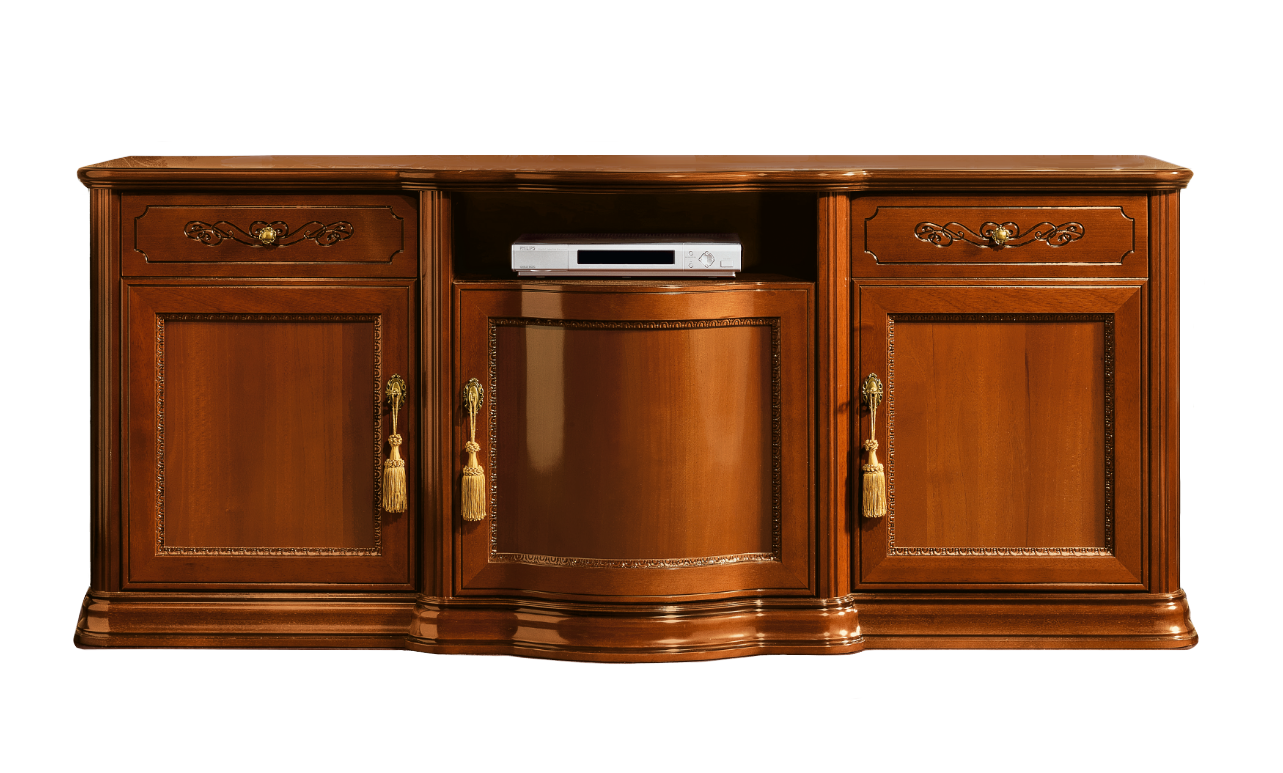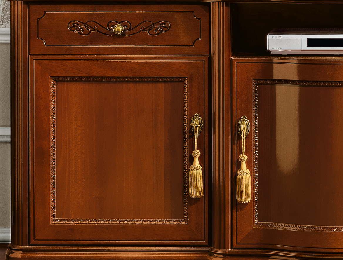 Wyjątkowy mebel wykonany z drewna w ciemnym wybarwieniu o delikatnym połysku. Zjawiskowego charakteru dodają drzwiczkom ozdobne lamówki znajdująca się wzdłuż frontów po stronie wewnętrznej. Charakteru dodaje zaokrąglenie środkowego frontu, oraz pozłacane uchwyty i umieszczone na nich frędzle.