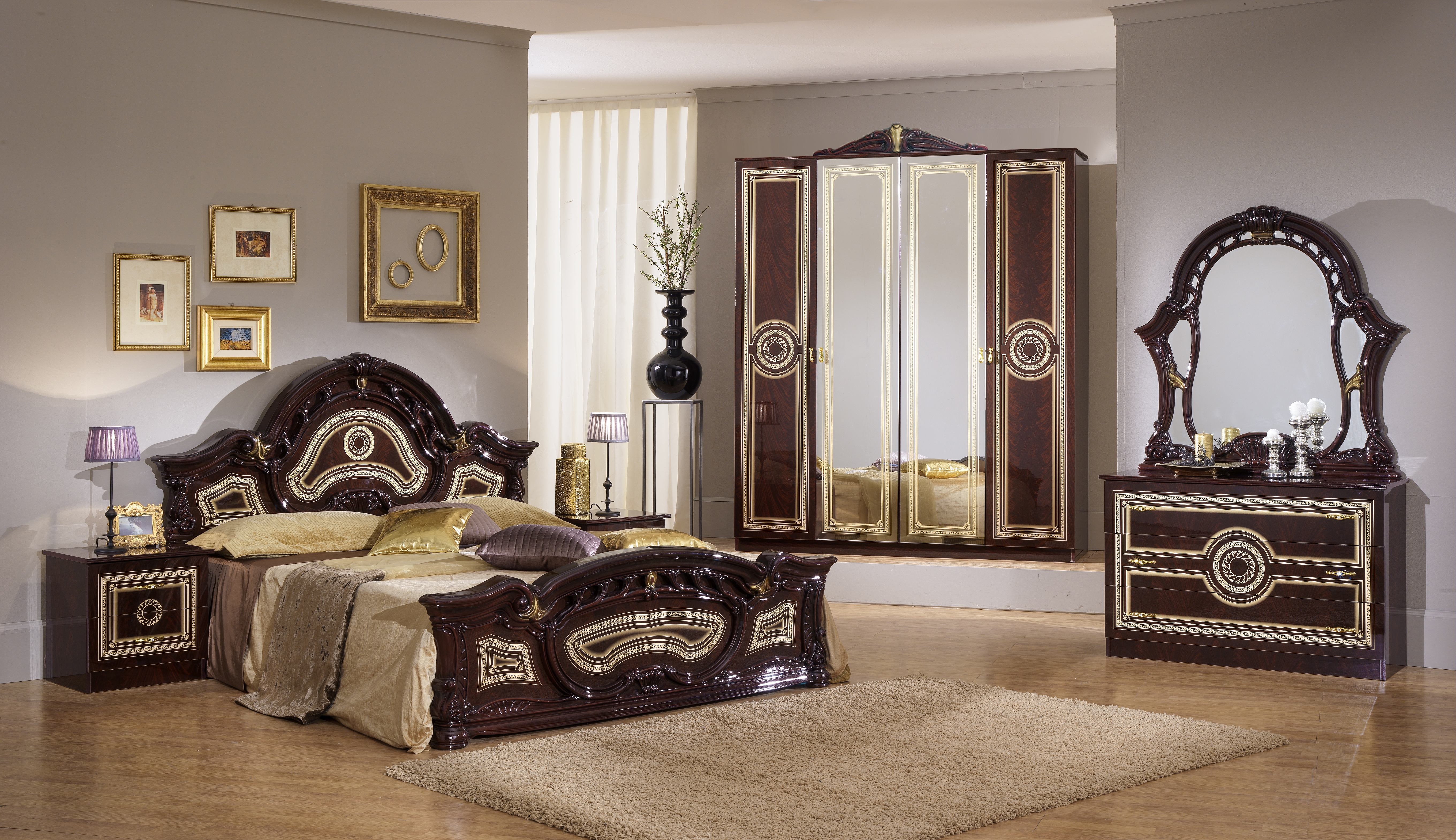 Charakterystycznym elementem szafki są zdobienia w złotym kolorze, które nadają jej eleganckiego i luksusowego wyglądu, podkreślając wyjątkowy styl całej kolekcji