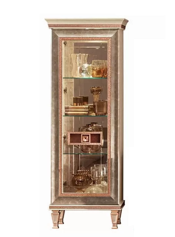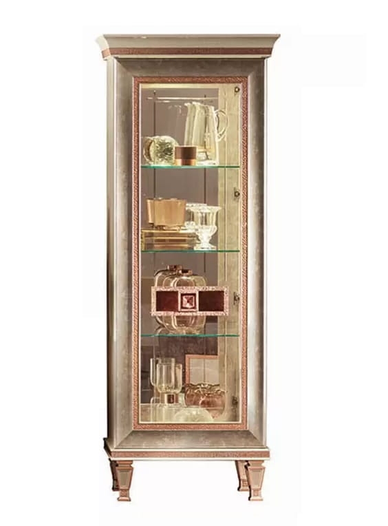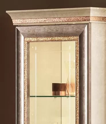 Szklana gablota nie tylko dopełnia całą kompozycję, ale także zapewnia dodatkowe miejsce do przechowywania w pokoju, a także daje możliwość wyeksponowania designerskich akcesoriów i najlepszej zastawy stołowej. Szkło w połączeniu z wykończeniami w kolorze różowego złota wydobywa pełnię blasku mebla, a opaska z wrzośca z orzecha podkreśla elegancję mebla, tworząc niewielką przerwę w kolorze kości słoniowej, która pokrywa całą strukturę.