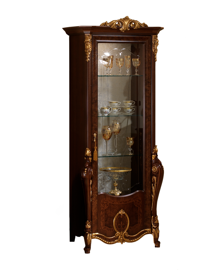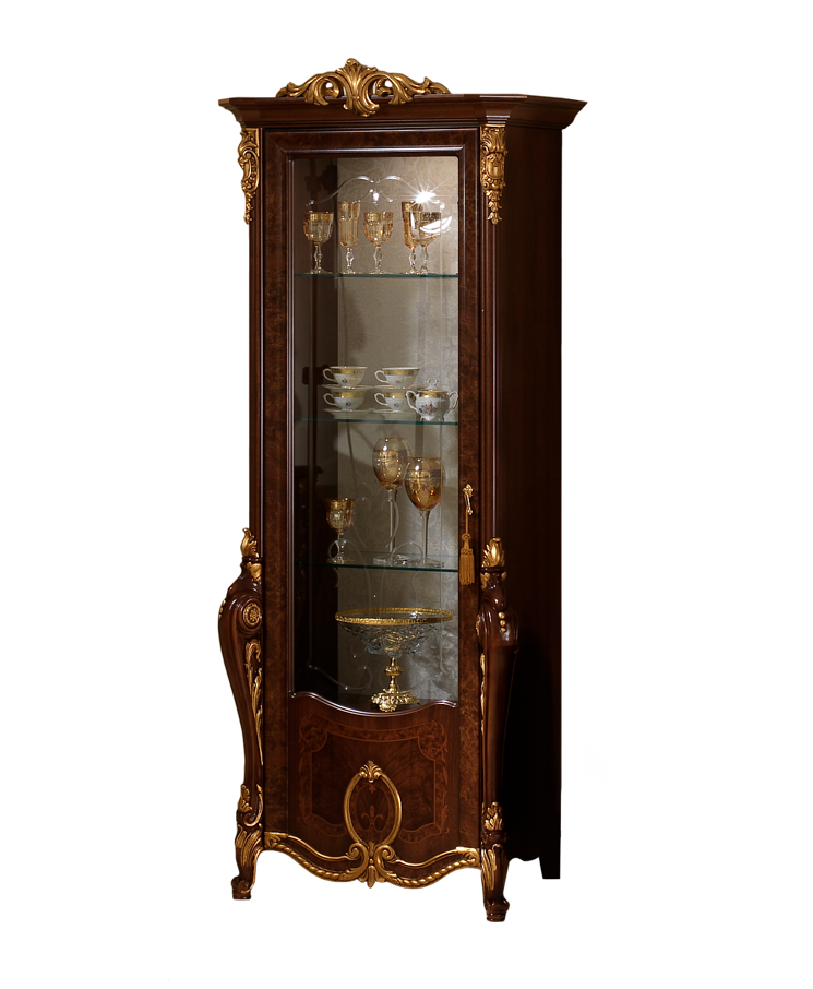 Włoska witryna Donatello to mebel który zachwyca swą formą i starannością wykonania. Witryna posiada piękne złote zdobienia które dekorują koronę mebla, elementy rzeźbień oraz drzwi. Eleganckie uchwyty wieńczą złote ozdobne chwosty. Mebel cechuje ciemne, wyjątkowo eleganckie wybarwienie drewna a jego ciepła tonacja dodaje mu niezwykłej klasy. Witryna Donatello zarówno dzięki zdobieniom, odcieniowi jak i formie doda wnętrzu elegancji i szyku, a jej klasyczny charakter doskonale wpisze się w stylowe wnętrze.