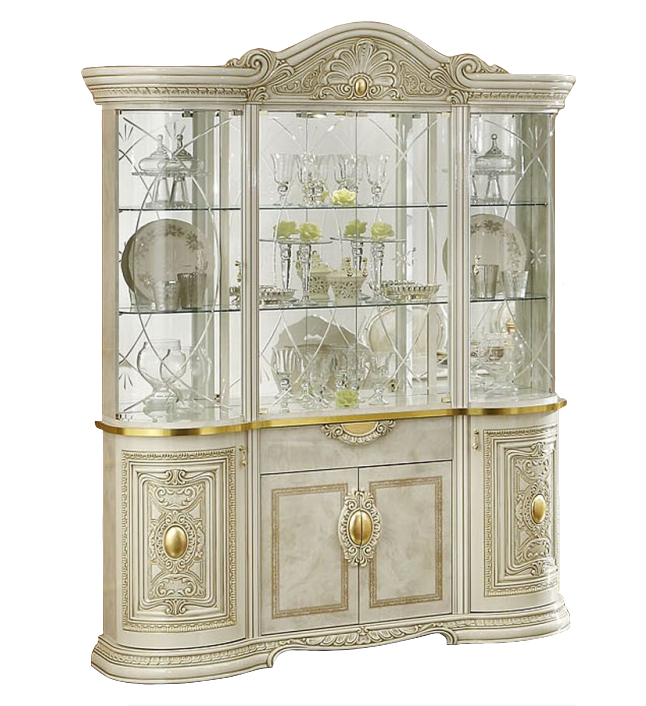 solidna 4 drzwiowa witryna z kolekcji Leonardo w eleganckim beżowym kolorze z elementami złota. Mebel zachwyca swoim wyglądem, a jednocześnie jest bardzo praktyczny. Zastosowane materiały w produkcji to: panele MDF, płyty płasko prasowane, płyty wielowarstwowe, całość pokryta wieloma warstwami lakieru poliestrowego, który nadaje efekt wysokiego połysku. Witryna posiada oświetlenie halogenowe.