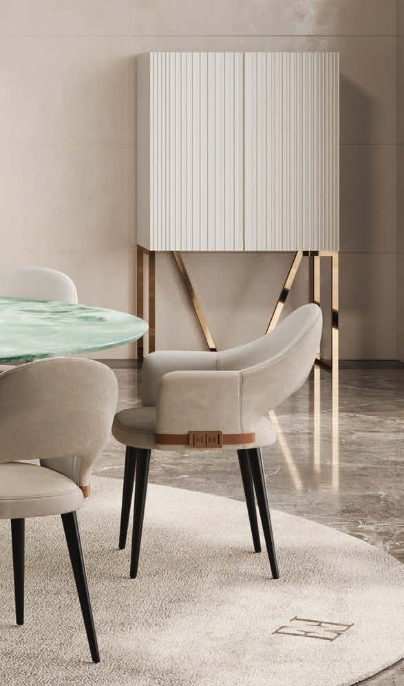 Stylowa szafka o nowoczesnym, wyrazistym designie, która przyciąga uwagę eleganckimi detalami. Osadzona na geometrycznej, złotej podstawie prezentuje się lekko, a jednocześnie stabilnie, dodając wnętrzu nuty luksusu.